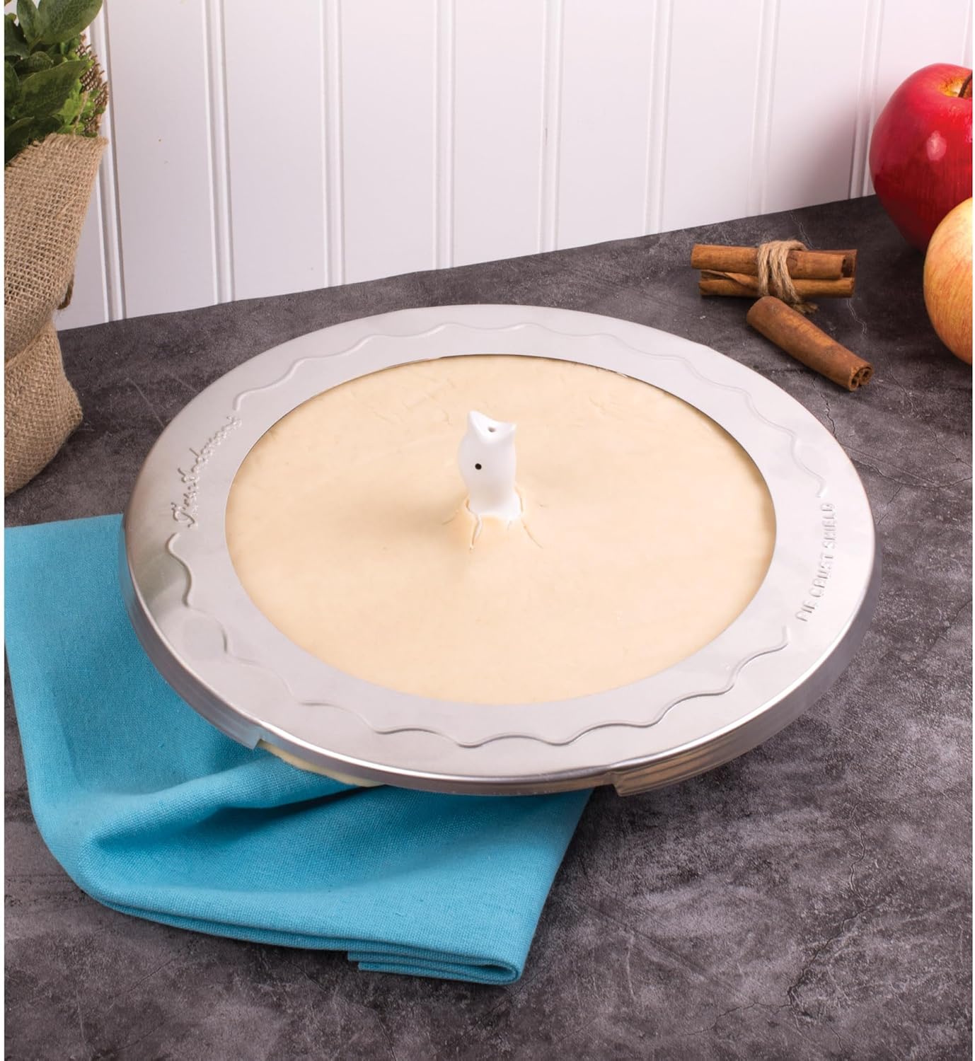 - Steam vents through the bird’s beak to prevent pie filling from bubbling over; top crust is supported by the bird’s shoulders, eliminating bowed crust
