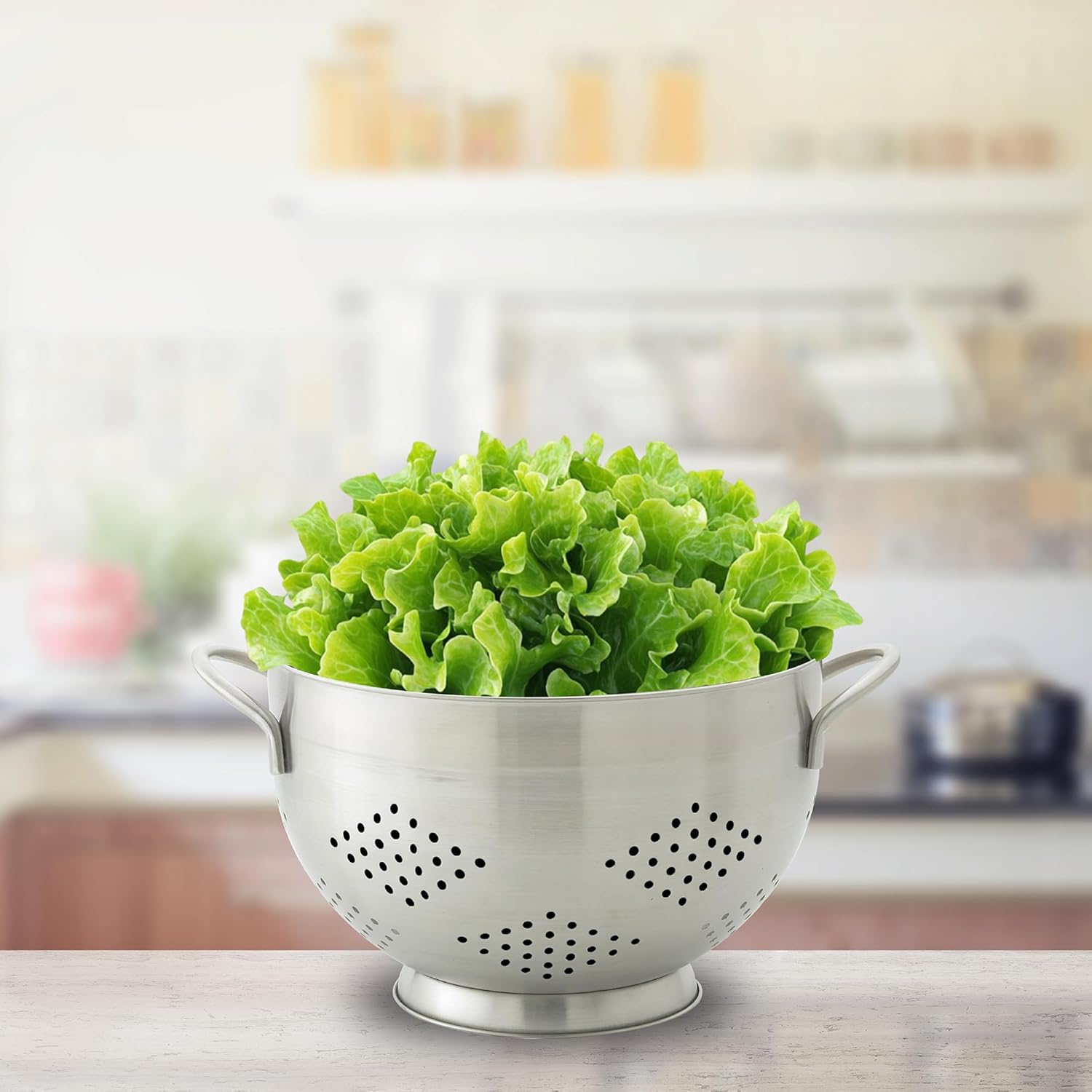 - Pierced stainless bowl tackles heavier tasks; footed base elevates contents above draining liquids, like produce, pasta, grains, vegetables, and more