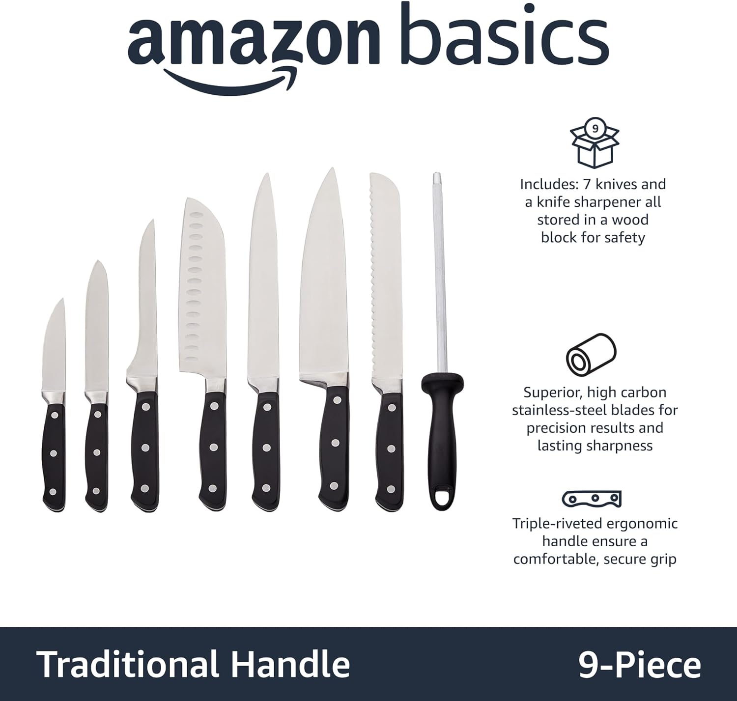 Amazon Basics 9 Pieces Premium High-Carbon Stainless-Steel Blades with Pine Wood Knife Block Set, Kitchen, Black