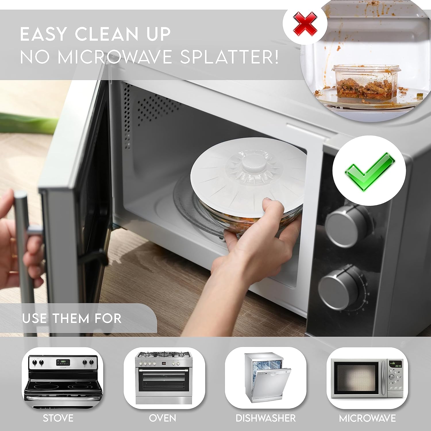 - MAKE YOUR LIFE EASIER - No more fighting with plastic wrap! End microwave splatter clean up! And big plus- they're easy to clean! Just wipe with mild cleanser or use the dishwasher. Our natural fit handles are easy to grip even for weakened hands that won't slip and break. And storage is a breeze because these lids are Interlocking, so they help save space and reduce clutter.