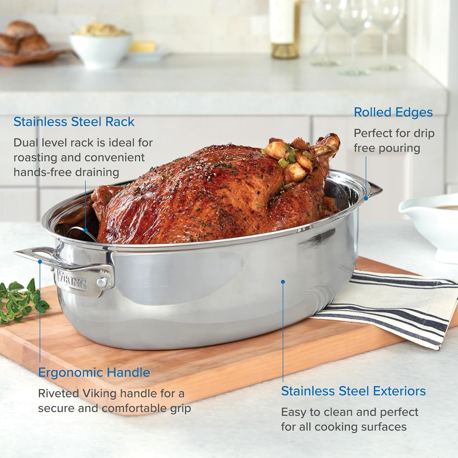 - 3-IN-1 OVAL ROASTER PAN WITH LID: Prepare a juicy turkey or a tender roast with the Viking Stainless Steel Oval Roasting Pan! Perfect for home cooks, this roasting pan features an elevated wire rack to promote even heating and can hang from the rim of the roaster for easy draining; add the lid to convert the pan into a 9 Quart (to rim) covered roaster, dutch oven or stockpot, and the lid can also be used separately as an Au Gratin, saute, or casserole serving vessel
