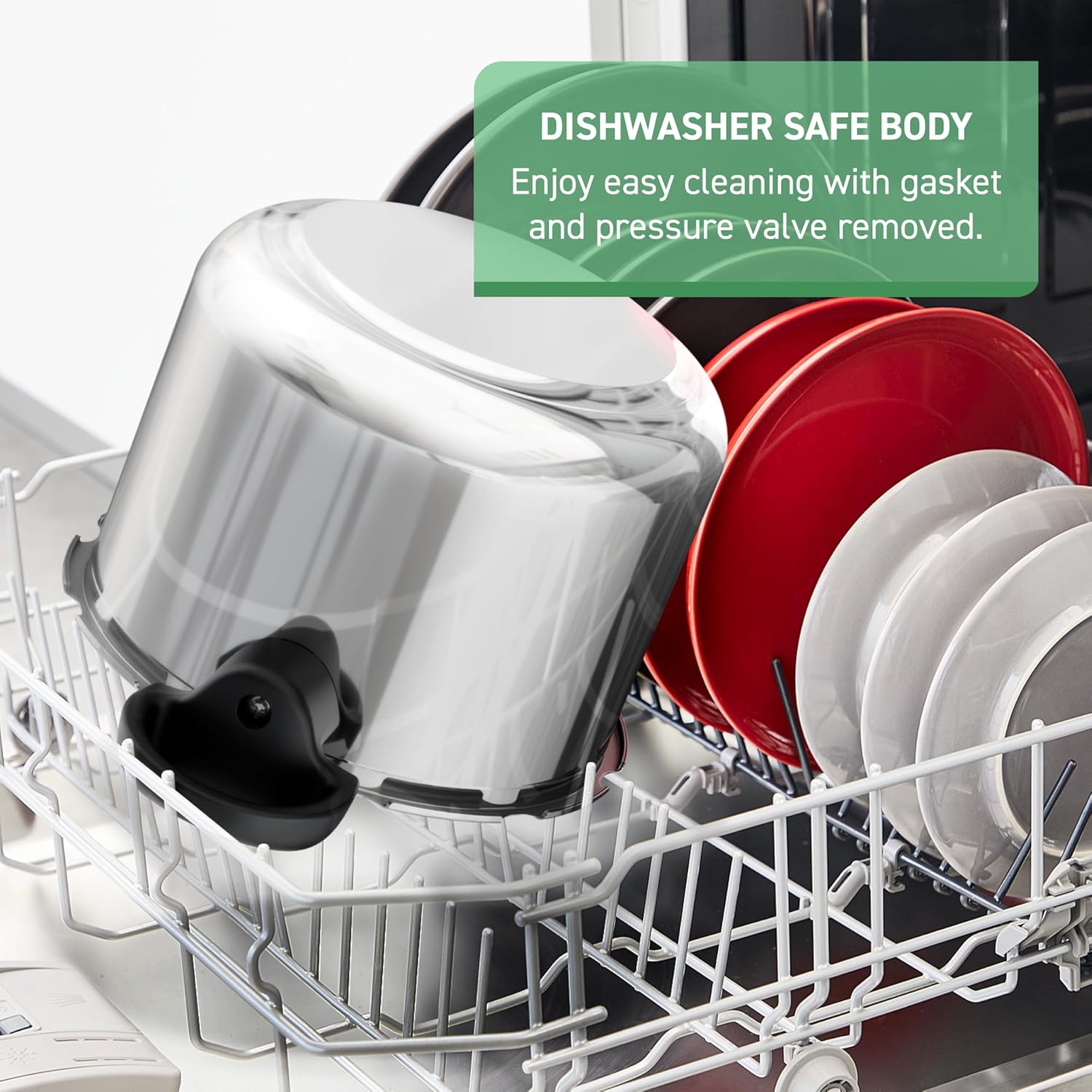 - Effortless Cleanup: Spend less time scrubbing and more time enjoying delicious food thanks to the easy-to-clean stainless steel construction. With the gasket and pressure valve removed, put your pressure cooker in the dishwasher. Limited Lifetime Warranty