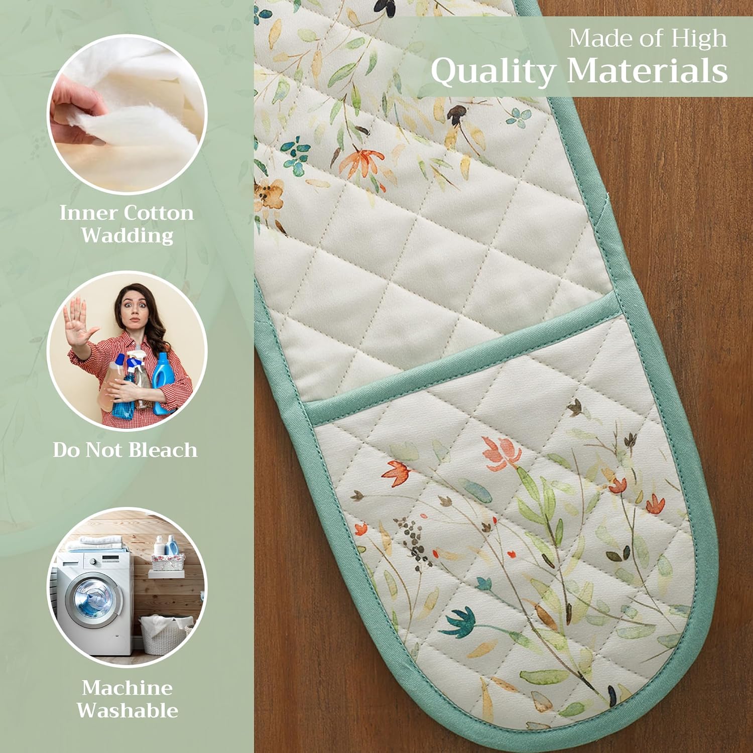 - 100% Quilted cotton: Crafted from premium quilted cotton for superior heat resistance and durability. This double oven mitt offers a soft, flexible grip and protects your hands during baking, roasting, or grilling