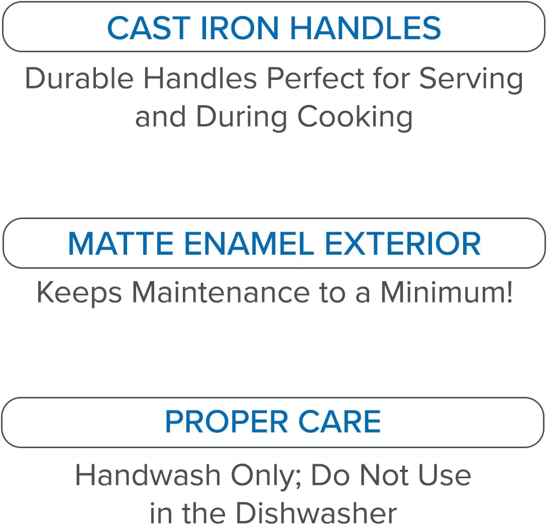 - DURABLE AND EASY TO CLEAN: Our professional quality cookware is built to last with a heavy duty cast iron construction with a non-reactive glossy enamel interior which is strong enough to handle metal utensils while maintaining the flavor while cooking; while not nonstick, the enamel coating does feature stick-protective properties which aid in clean up