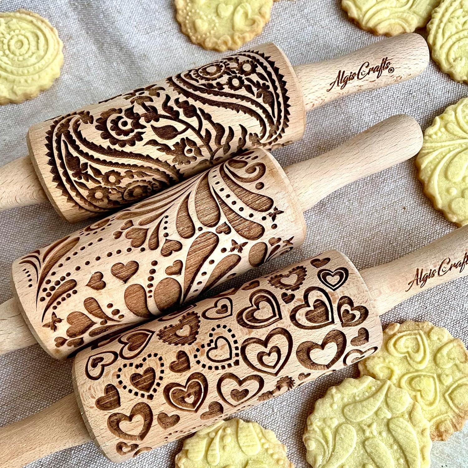 LOVELY DAY 3 KID Rolling Pin SET with HEART, PAISLEY and SPRING patterns. Wooden Laser Cut Mini embossing Rolling Pins for cookies, play dough, salt dough or clay by Algis Crafts