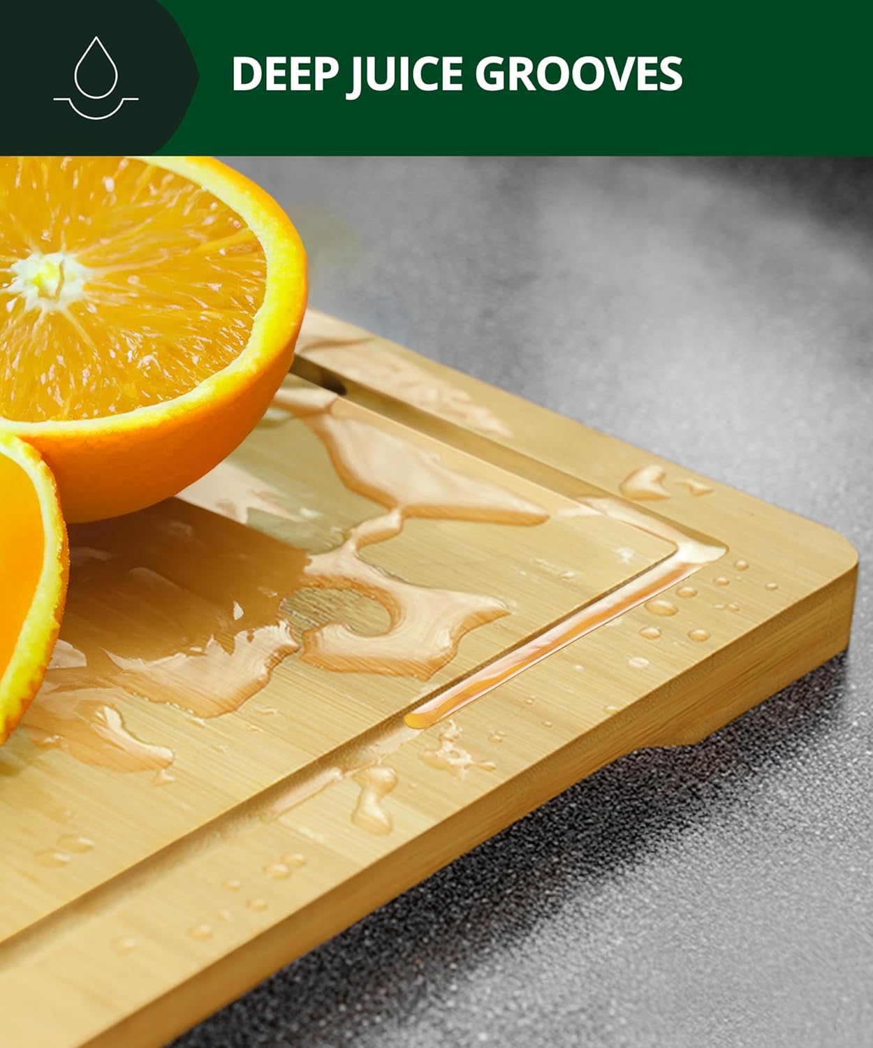 - ECO-FRIENDLY: Made from 100% natural bamboo, our board is sustainable and environmentally friendly. The durable construction, reinforced with a special resin seal, ensures the board resists cracking, warping, or splitting. Plus, it's slip-resistant for safe slicing and dicing without worry.