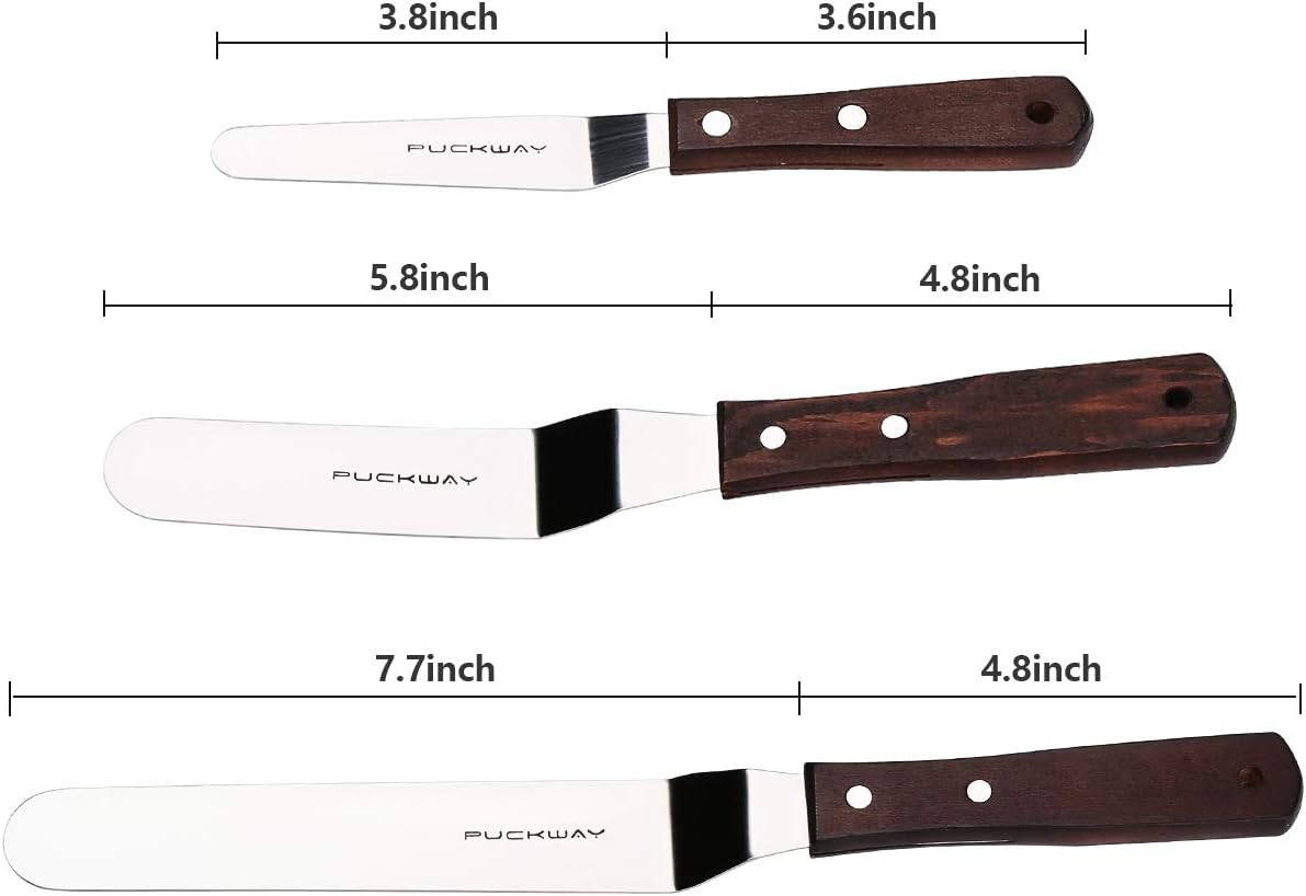 - Three Professional Cake Decorating Spatulas: Our offset spatula set comes in three different sizes: 4" - 6" - 8" blade (total 7.5''-10.8''-12.8''), This is your best choice to decorate a cake perfectly.