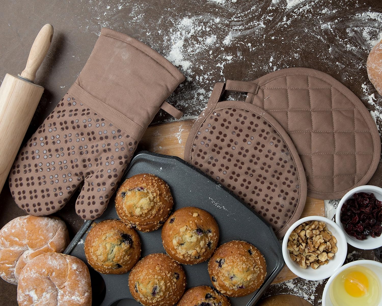 Sticky Toffee Oven Mitt and Pot Holder Set of 3 – Brown Non-Slip Silicone Kitchen Hot Pads and Mitts, 100% Cotton Shell, Oeko-Tex Cotton