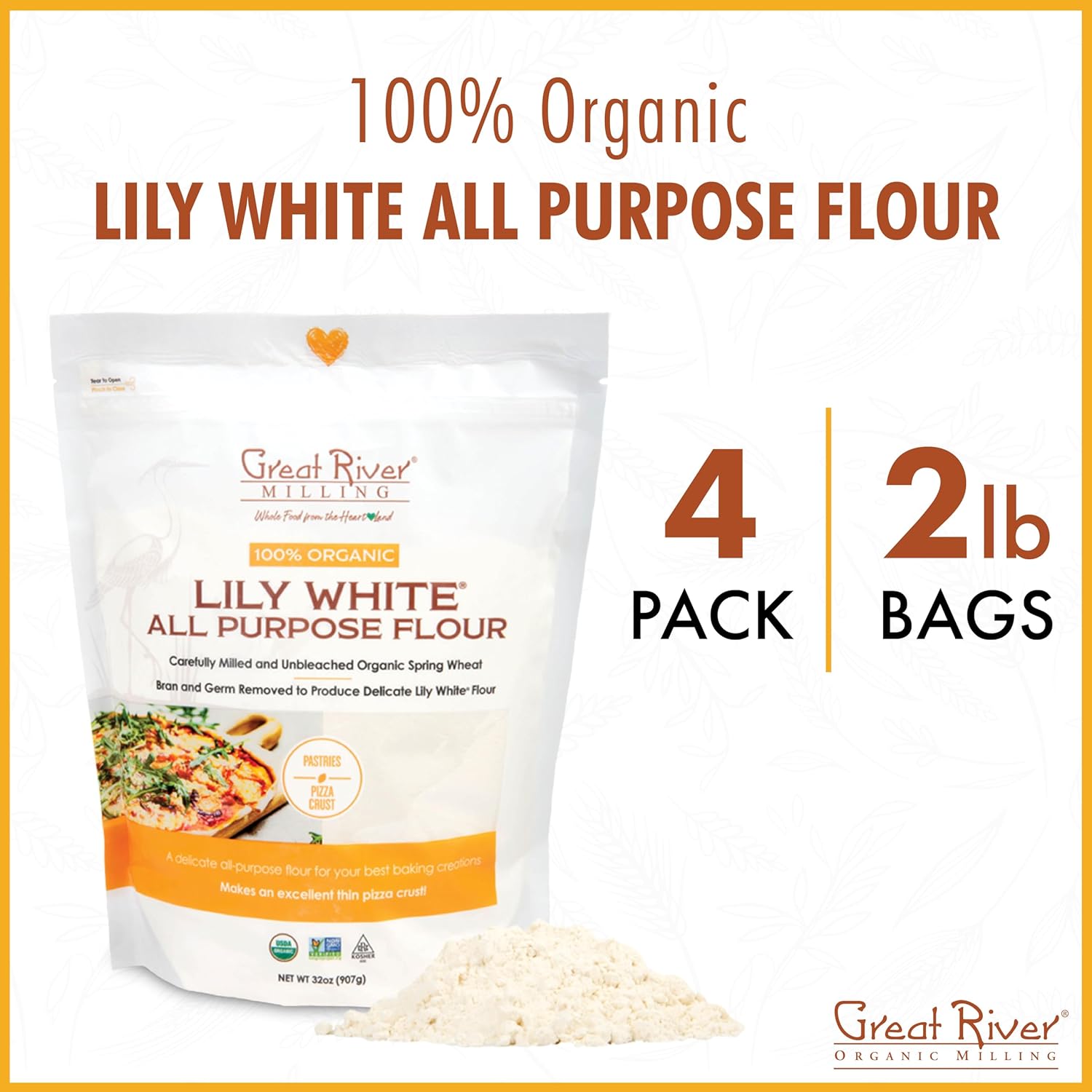 Great River Organic Milling Lily White Organic All-Purpose Flour | Unbleached & Unbromated | Non-GMO, Kosher | Ideal for Bread, Cookies, Cakes, Pizza Dough & Everyday Baking | 2 Lb (Pack of 4)