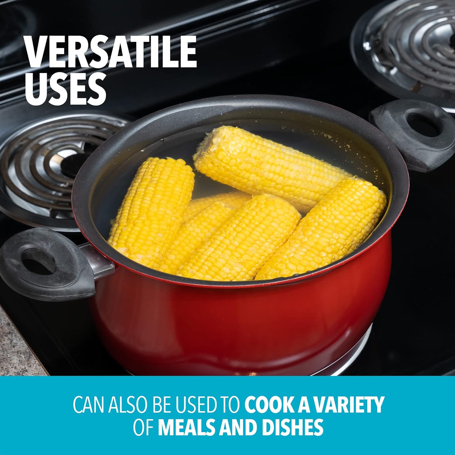 - 5.5-QUART COOKING POT: This large kitchen pot can accommodate up to 1.5 lb. of pasta, 5 lbs. of chopped potatoes, 12 cups of broccoli, 8 ears of corn, or one whole lobster. It is a great gift option for wedding registries or to keep for yourself.