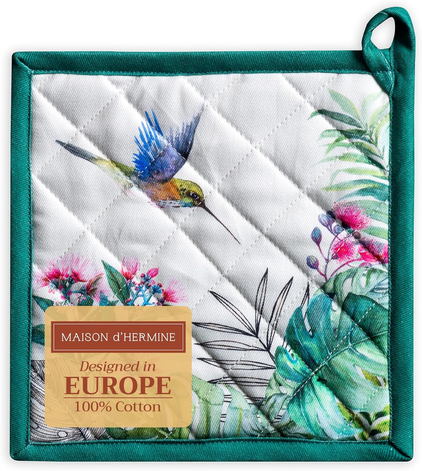 Maison d' Hermine Pot Holders 100% Cotton Heat Resistant Potholders 8" x 8" Hot Pads with Loop BBQ, Cooking, Baking, Grilling, Kitchen, Handling Hot Pans Spring/Summer (Pack of 1, Tropiques)