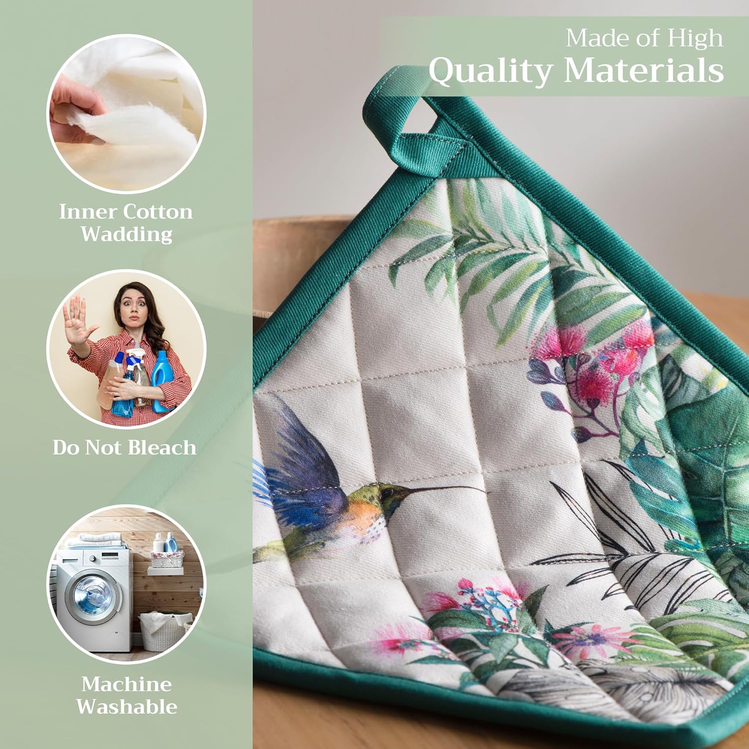 - 100% Quilted cotton: Made from premium quilted cotton, our pot holder ensures safe handling of hot pans or dishes. The soft, durable build provides excellent heat resistance and grip—perfect for everyday cooking and baking needs