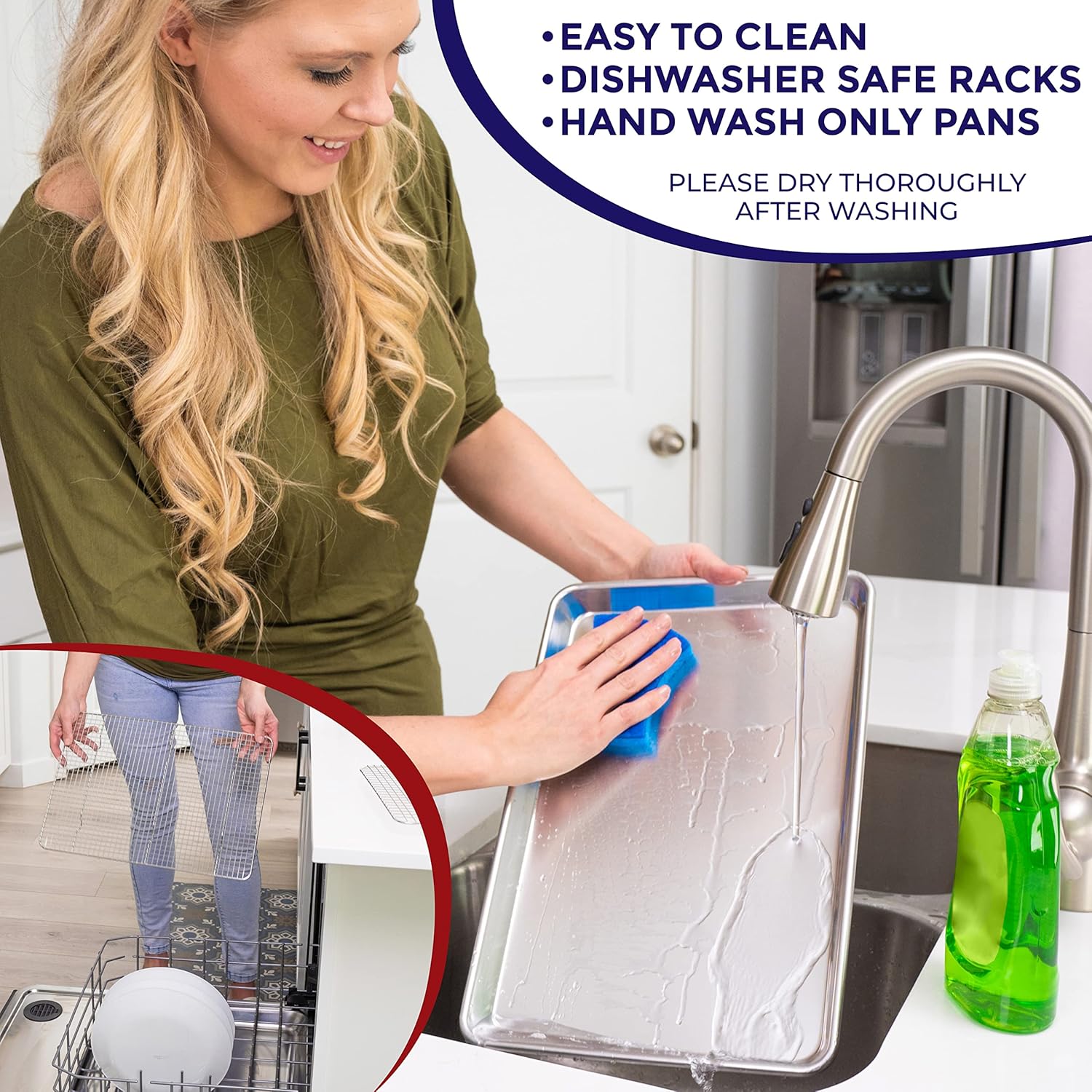 - Essential Cleaning Tip: Since the oven trays for baking are made of aluminum, they are NOT dishwasher safe. Let the pans cool a bit after use, then soak in warm, soapy water for 4 hours to get rid of tough stains. Make sure to dry completely especially on tehe crevices to avoid moisture build-up.