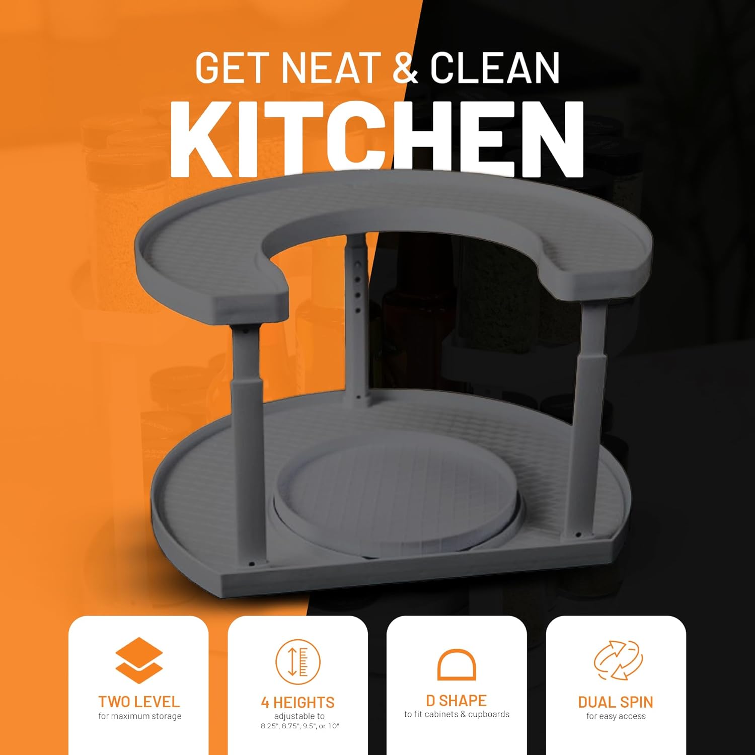 - Maximize Kitchen Space: This 2-tier D-shaped spice rack fits seamlessly in cabinets or on countertops, holding up to 40 spice jars while saving valuable space. Features adjustable shelf heights of 8.25", 8.75", 9.5", and 10" to fit a variety of cabinet sizes and jar heights.