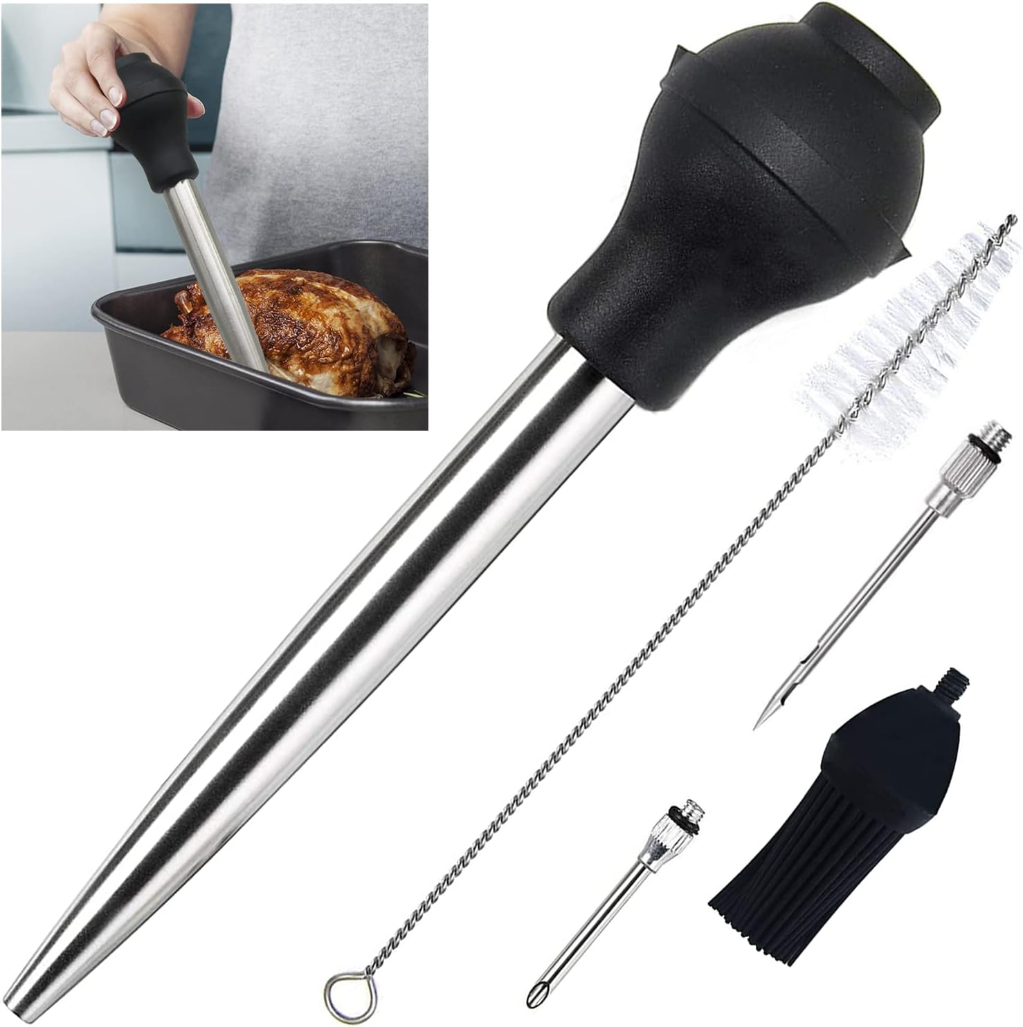 - Stainless steel injector needle and silicone basting brush included. Clean-up is easy with the included brush