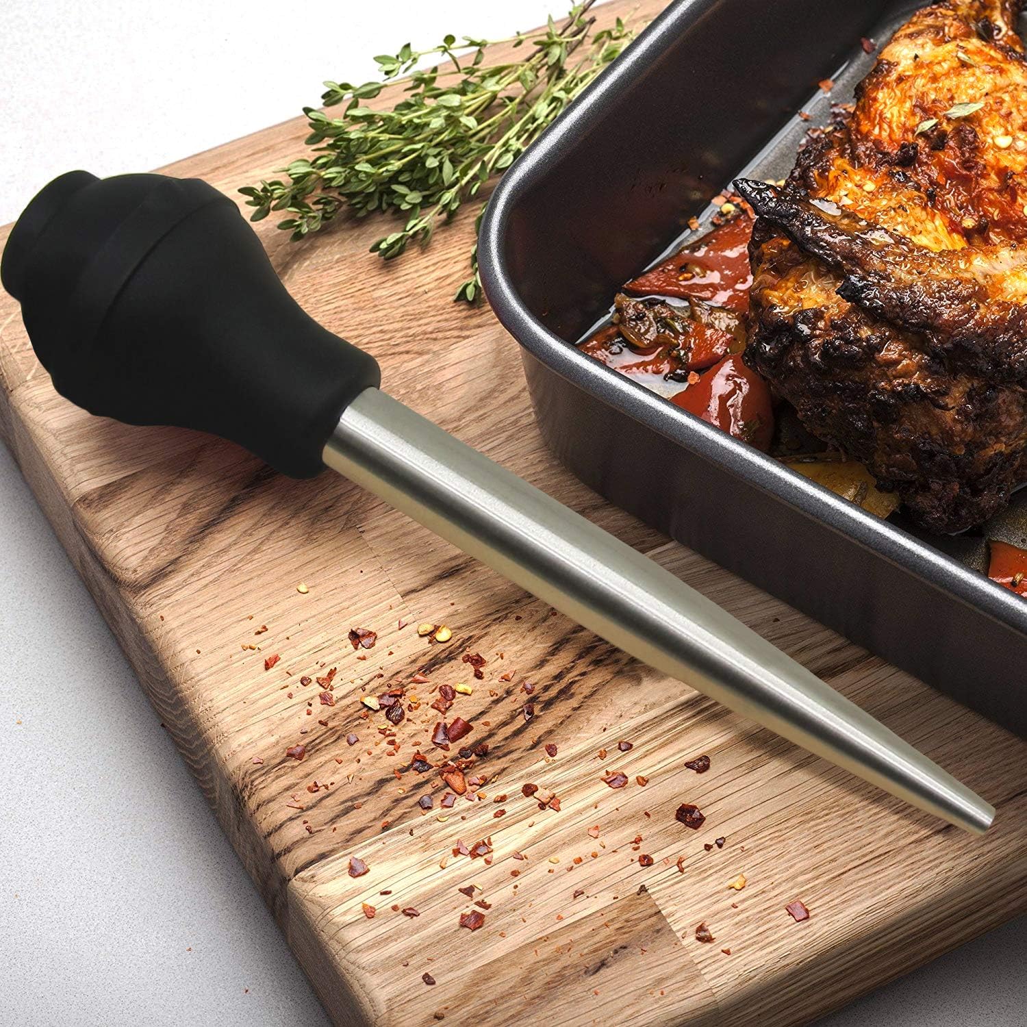 - Baste poultry and roasts for moist, flavorful cuts without mess. Angled band on the bulb keeps baster steady on countertop when not in use.