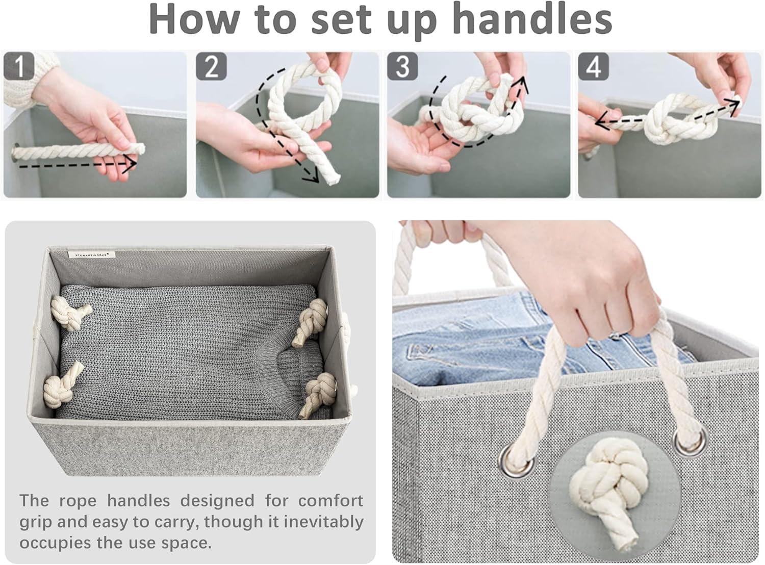 - Closet baskets feature two soft rope handles for comfortable grasping and easy carrying.