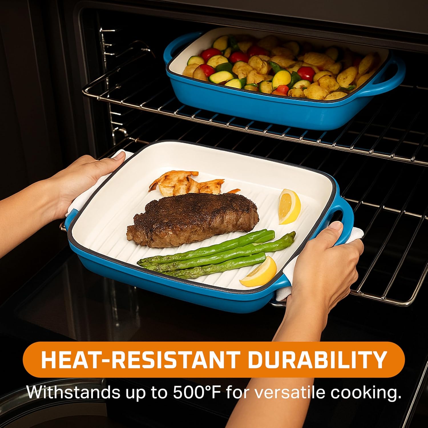 Bruntmor 2-in-1 Pre-Seasoned Square Cast Iron Dutch Oven with Dual Handles, Non Stick Pan with Grill, All-in-One Cookware Set, Cast Iron Casserole Dish with Lid for Braising Dishes,Whale Blue