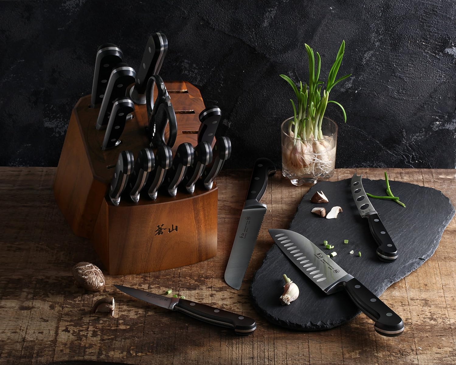 - Set Includes: 8" chef's knife, 8" bread knife, 7" santoku knife, 6" boning knife, 5" serrated utility knife, 5" tomato knife, 3.5" paring knife, 2.75" peeling knife, 6 x 5" serrated steak knives, 8" honing steel, 9" 2-piece Shears and a solid acacia wood block that houses each knife perfectly.