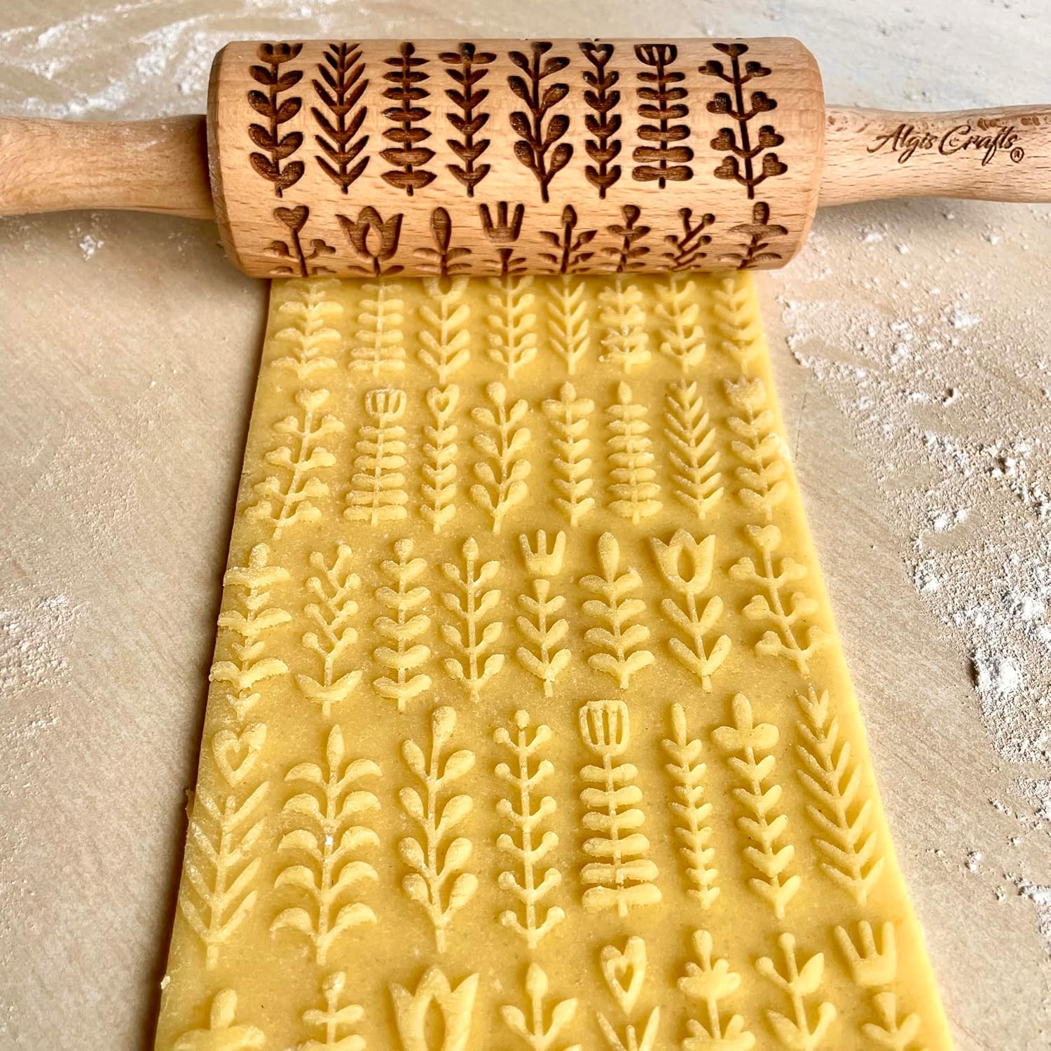 - COMFORTABLE DESIGN - This rolling pin with pattern is made with ergonomics in mind so that anyone can use its mesmerising designs! Rolling pin measures are approximately 9.5" (24 cm) from handle to handle, embossing part 4,5 inches (11 cm), diameter 2" (5 cm), made of beech wood. The finished product is food safe.