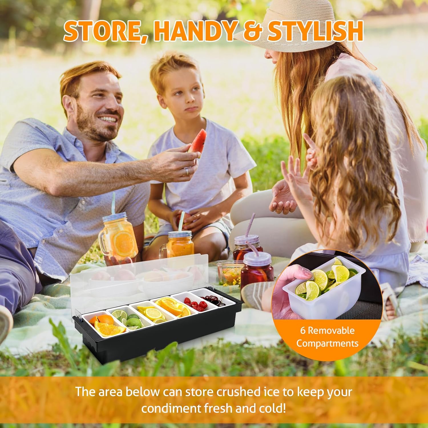 - ORGANIZE CONDIMENTS & GARNISHES - Our portable caddy has multi trays that have enough space to hold party food items, such as olives, pickles, fruit slices, nuts, seeds, gray, sauces and salad dips.
