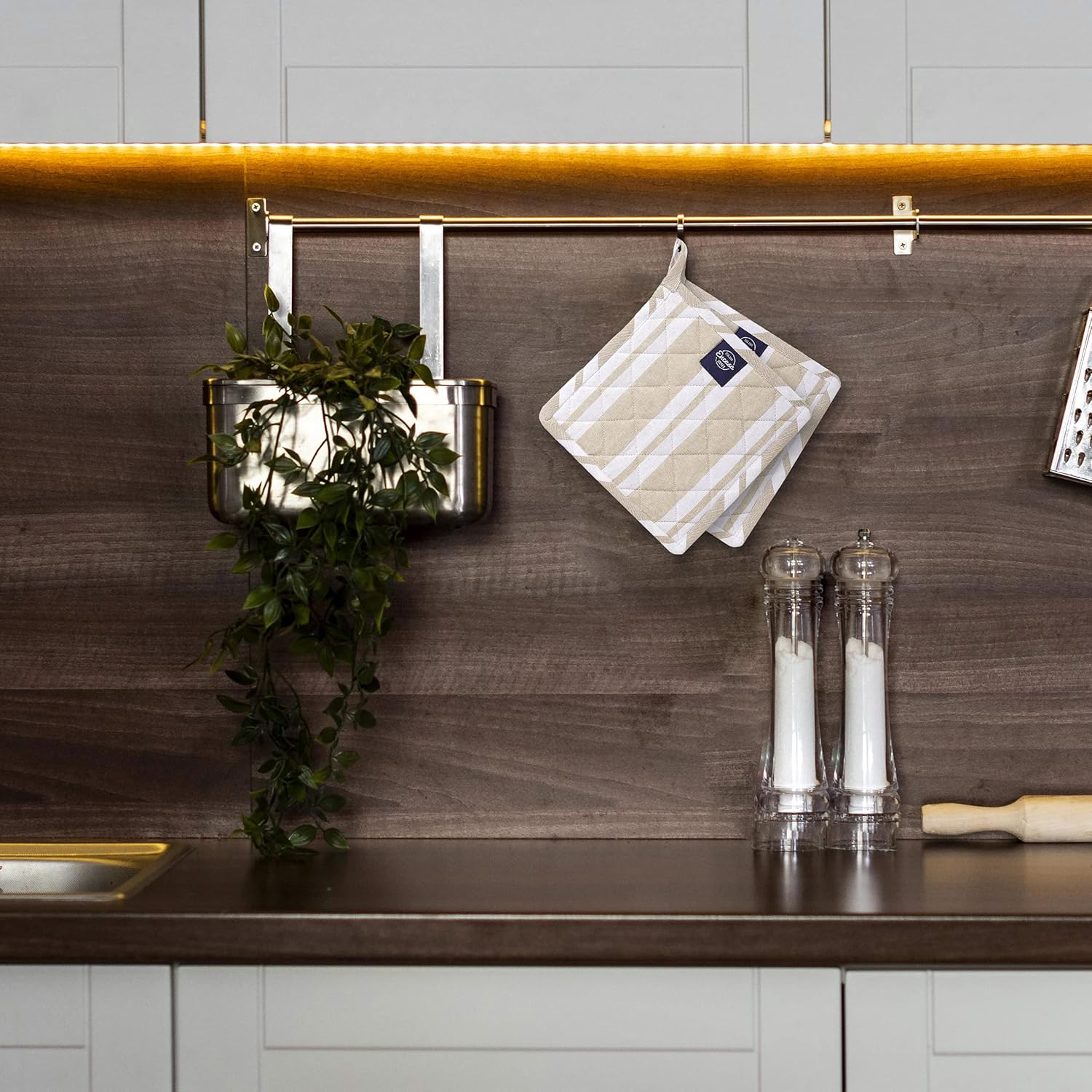 Encasa Homes 8 inches Oven Microwave Potholders (2 pc Set) for Kitchen Cooking & Baking - Heat Resistant, Thick & Safe, Protection of Hands from Hot Utensils - Franca Beige Stripes