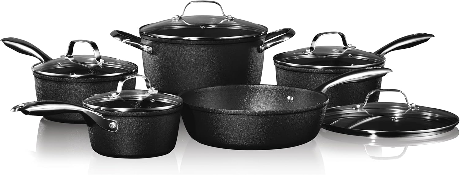 Starfrit The Rock Diamond 10PC Non-Stick Set - Durable Forged Aluminum - Oven Safe - PFOA Free - Easy to Clean - Black