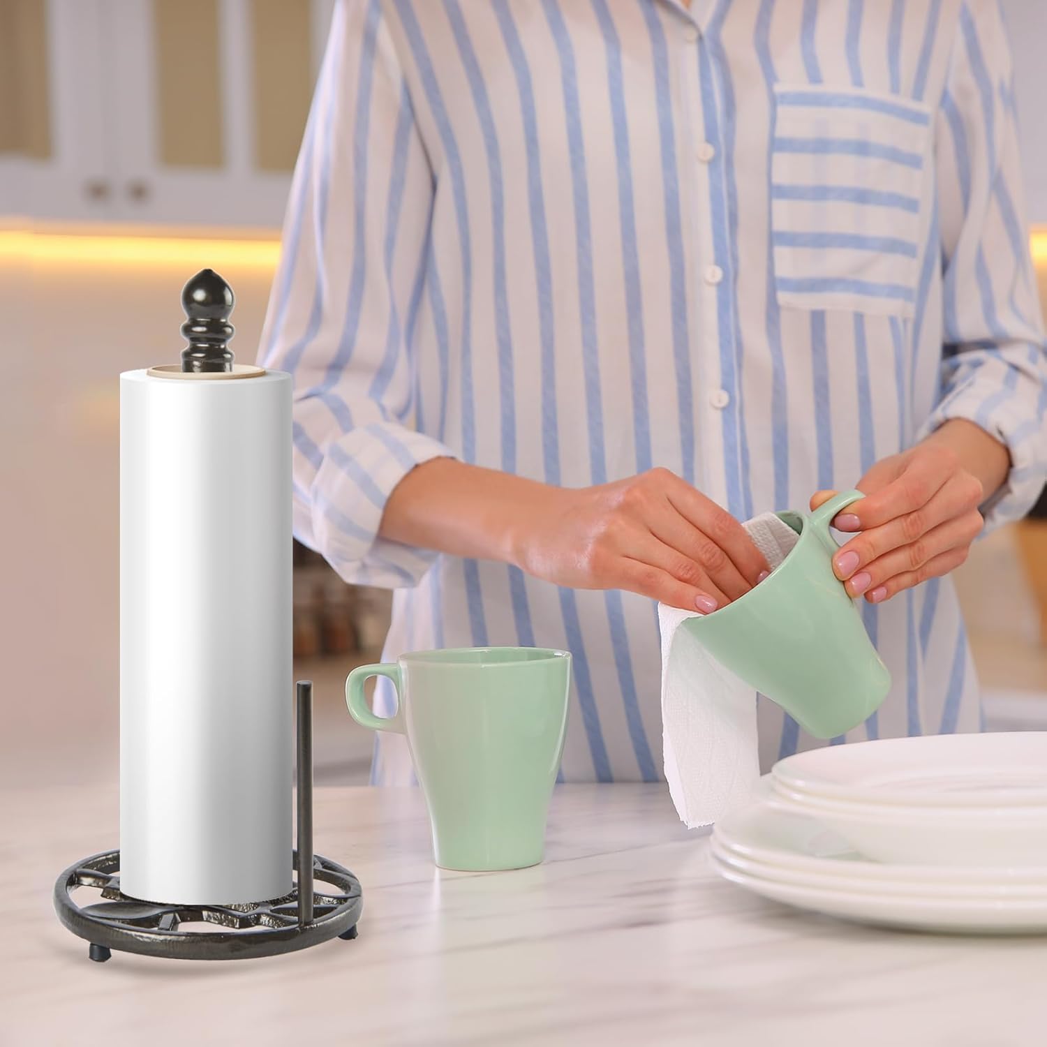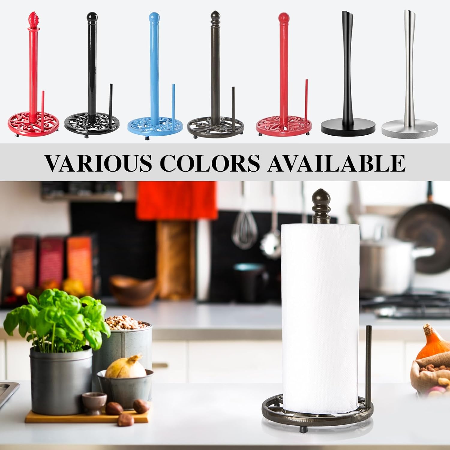 - Sturdy & Stable: Metal paper towel holder made of cast iron material which is Rustless, Fastness, Wear-resistant, Heat-resistant, Stable shape, Strong tension, Anti-aging, and Long service life. Wipe clean with a damp cloth