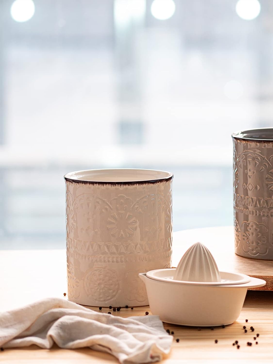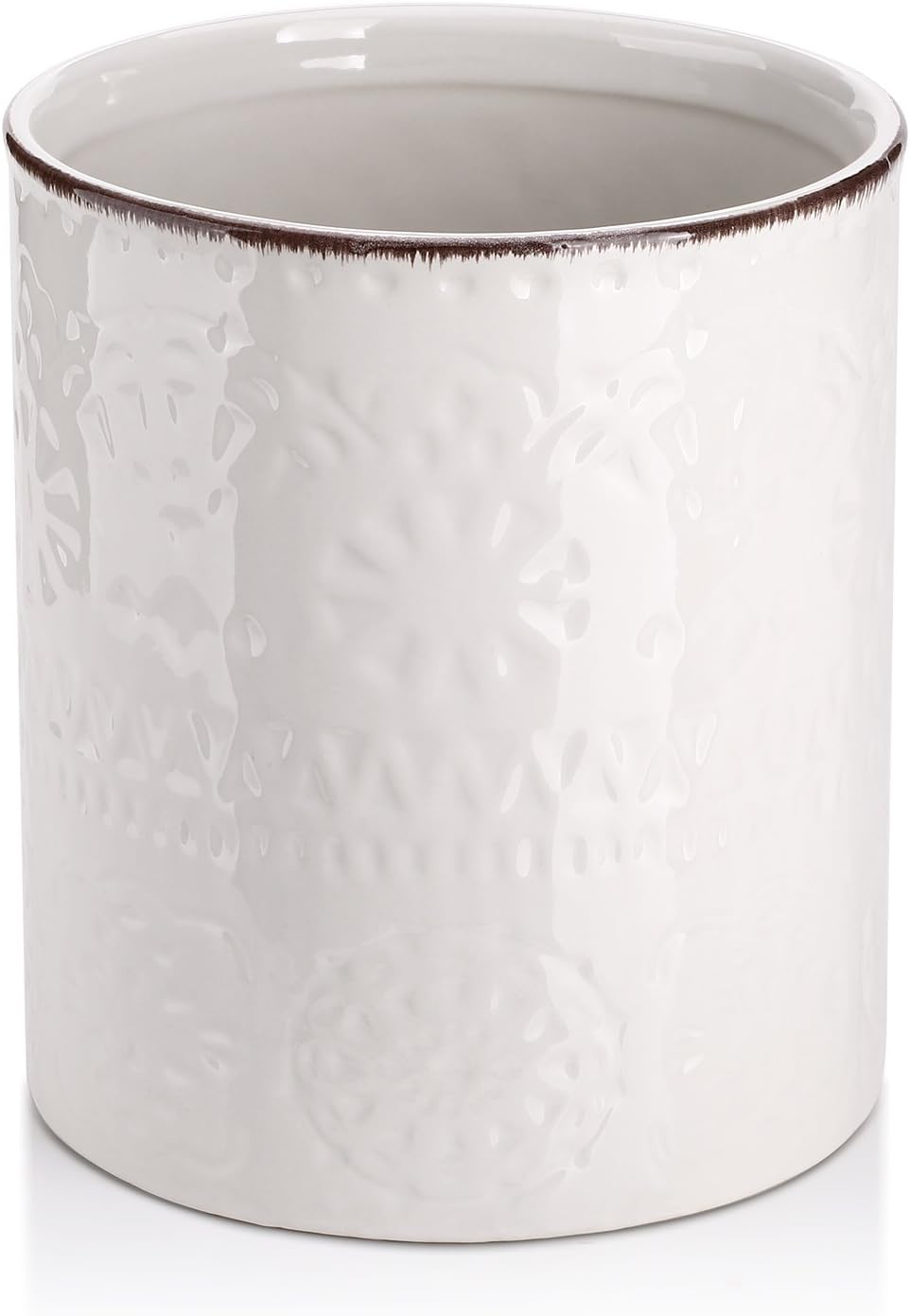 - Wonderful & Elegant Gift. Made of great quality, this utensil holder for countertop is very sturdy, and can be used for kitchen and be used as a planter pot. The hand-make beautiful and elegant relief with brown stripes on the edges, suitable for wedding or housewarming gifts.