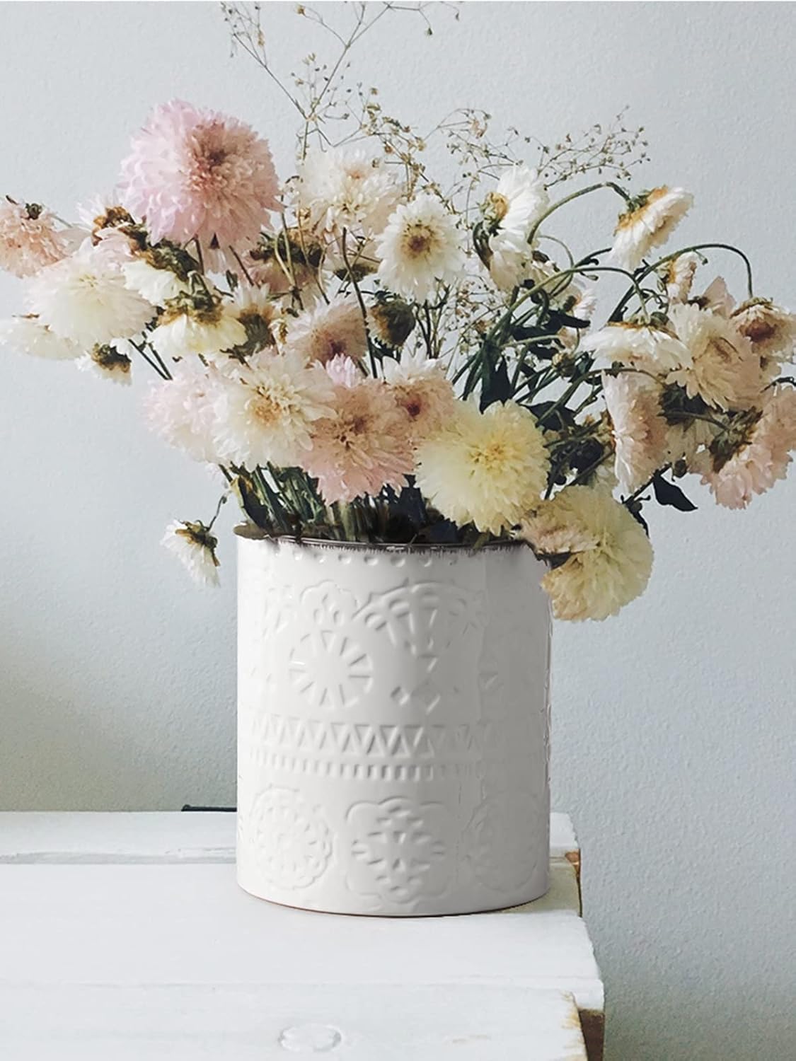 - Dimpled Imprint Fits Your Kitchen DÉcor. Beautiful design, awesome color and modern look must be a perfect and elegant compliment to your kitchen. This farmhouse white utensil holder for countertop will catch your eye at first sight.