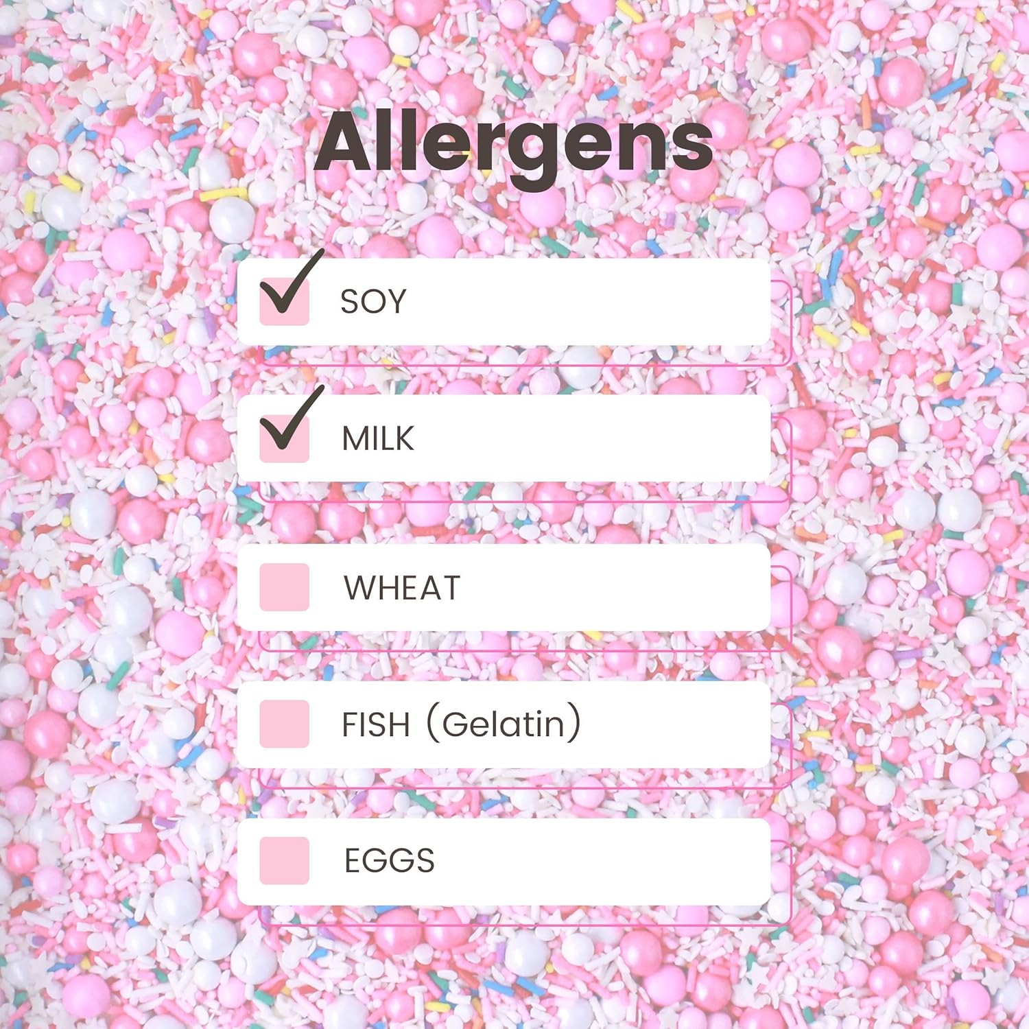 - Allergen & Safety Notice: Made in a facility that processes wheat, eggs, milk, soy, and tree nuts. Some blends contain hard sugar pearls and dragee rods, which may pose a choking hazard for children under 1