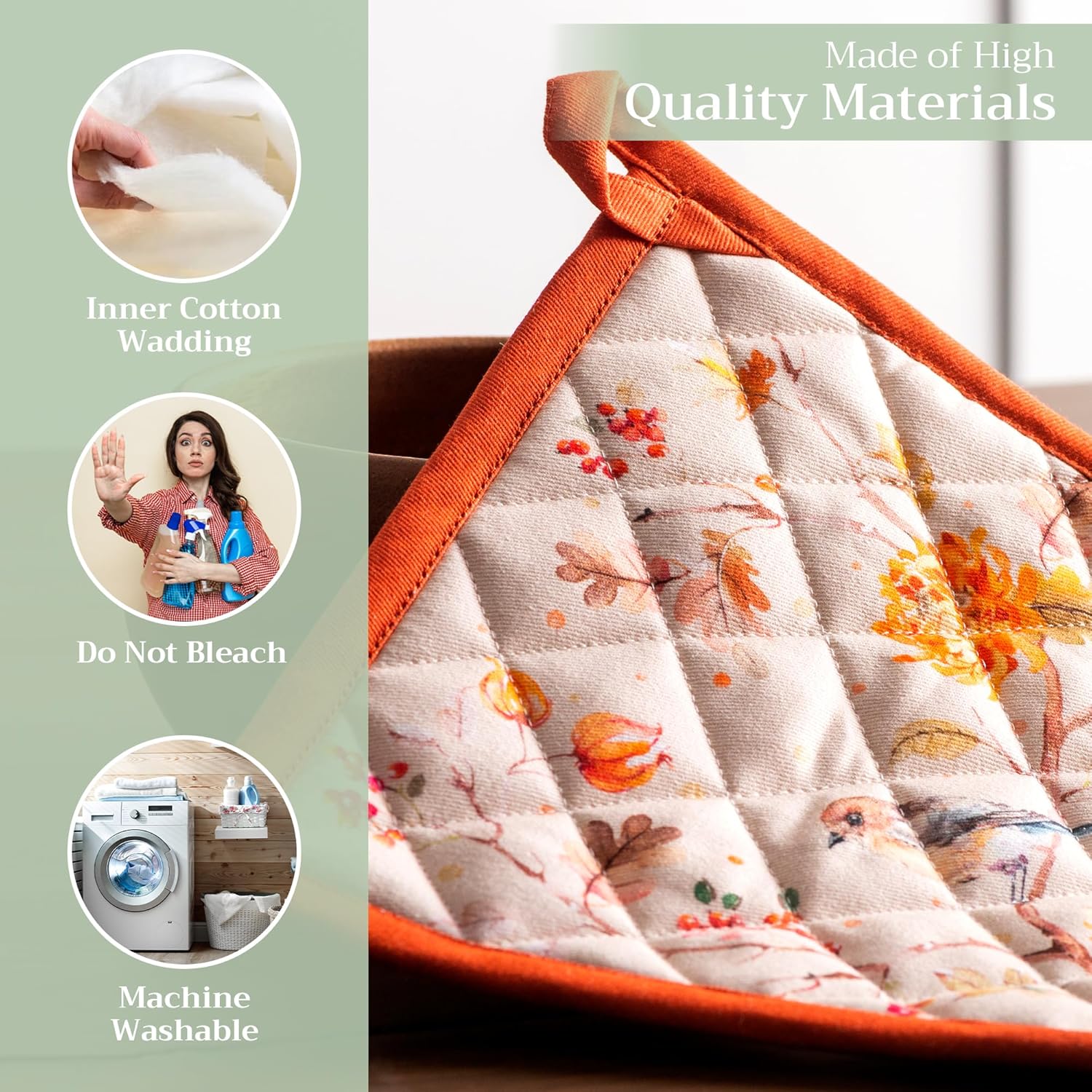- 100% Quilted cotton: Made from premium quilted cotton, our pot holder ensures safe handling of hot pans or dishes. The soft, durable build provides excellent heat resistance and grip—perfect for everyday cooking and baking needs