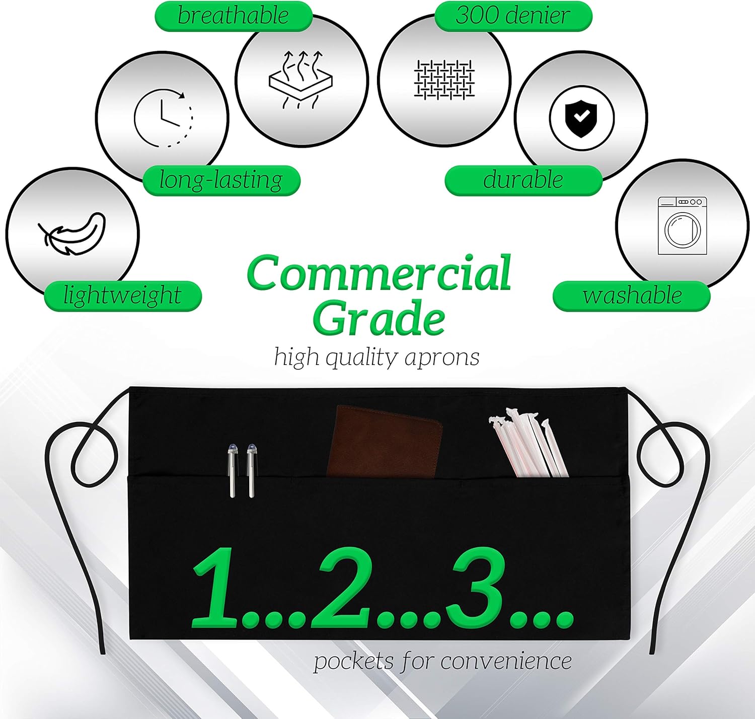 - 12 Pack Black Waist Aprons For Men And Women: The GREEN LIFESTYLE half apron for waiters and waitresses is made of commercial grade 100% Spun Polyester fabric to offer a durable, tough, tear-resistant and stain-resistant surface. Each aprons with pockets is specifically made to meet industrial grade standards so it is made to last and Machine Washable and will last you!