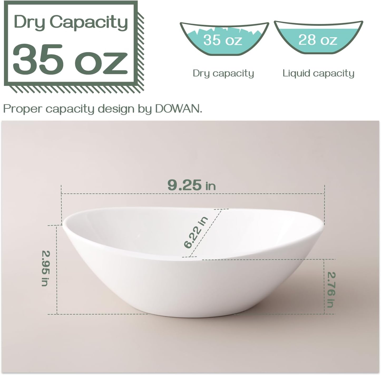 - Large Size, Multiple Uses: Perfect size, 9.25 "length, 6.22 "Width, 2.95"depth, 35 fluid ounces large capacity for double-serve meal size, serving dishes are suitable for salad, pasta, soup, side dishes, snacks and so on, catching guests' eyes for special occasions such as Wedding Parties.
