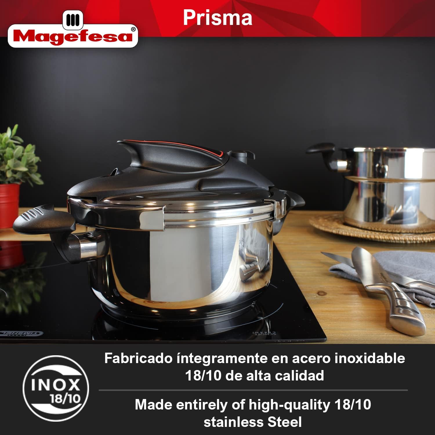 - Resistant materials: Magefesa Prisma pressure cooker is made of 18/10 stainless steel that is highly resistant to wear and oxidation, with an Impact bonded bottom thermo-diffuser for even heat distribution that makes it suitable for all domestic and profesional stoves, including gas, electric, ceramic and induction.