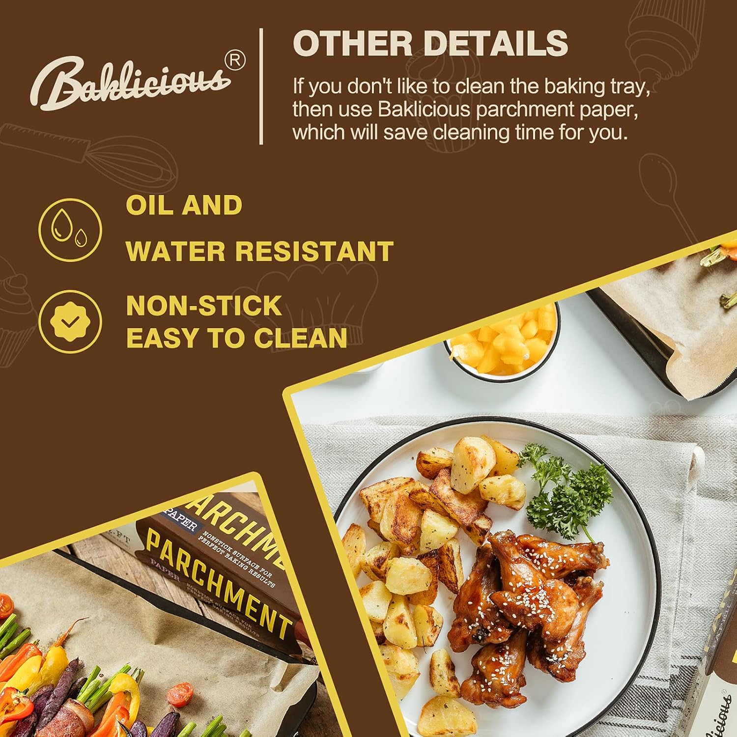 - HEALTHY & NON-TOXIC--Baklicious parchment paper for baking made from natural 100% wood pulp and totally fluorescent free without chemical composition. You can put your foods on it without hesitation. It can be used to bake vegetable,bread and cookies.