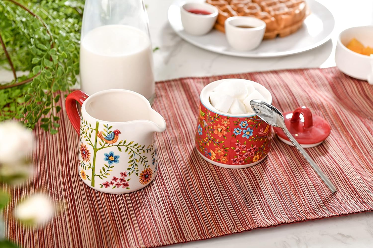 Bico Red Spring Bird Ceramic Sugar and Creamer Set, Sugar Bowl with Lid, Cute Container for Coffee Bar, Kitchen Countertop Accessories, Microwave and Dishwasher Safe