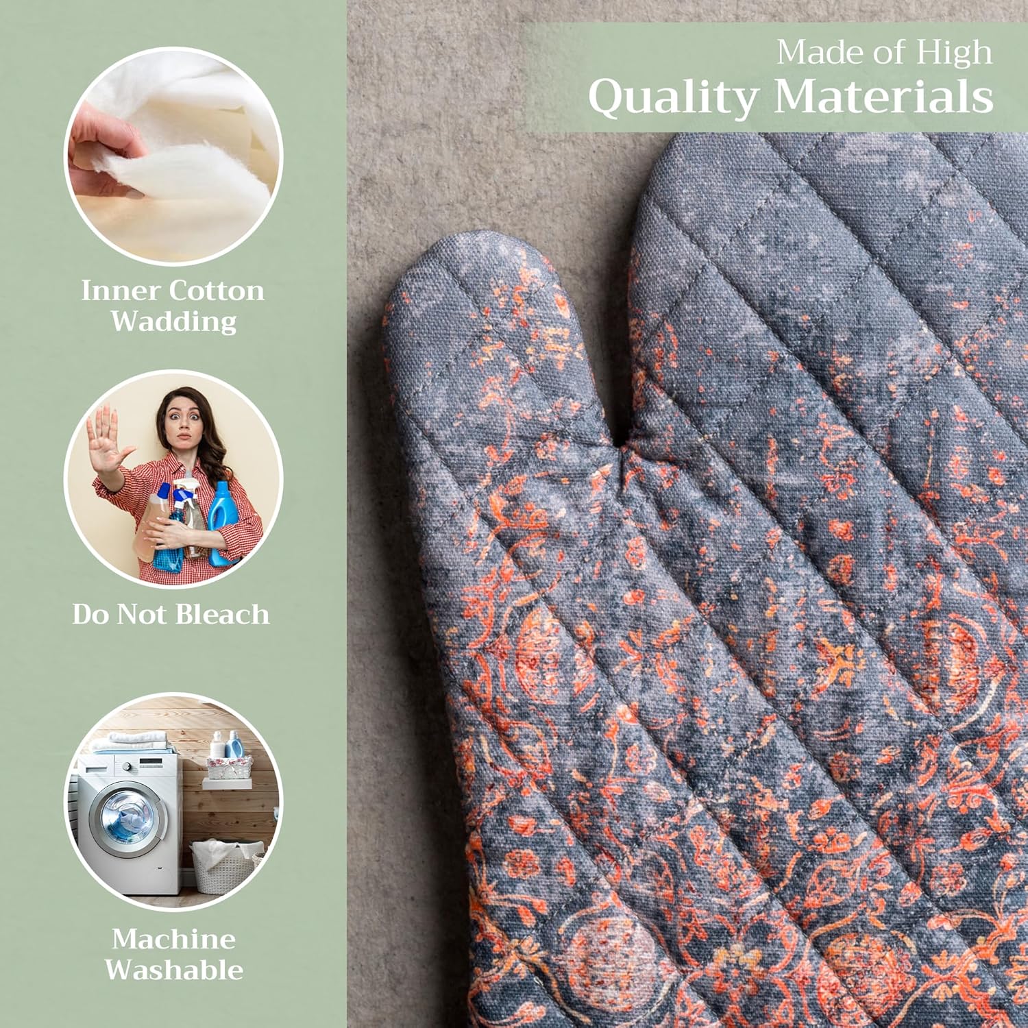 - 100% Quilted cotton: Crafted from thick, durable quilted cotton, this heat resistant oven mitt provides a soft feel, safe handling, and lasting performance. A must-have kitchen accessory for everyday cooking, roasting, or baking tasks