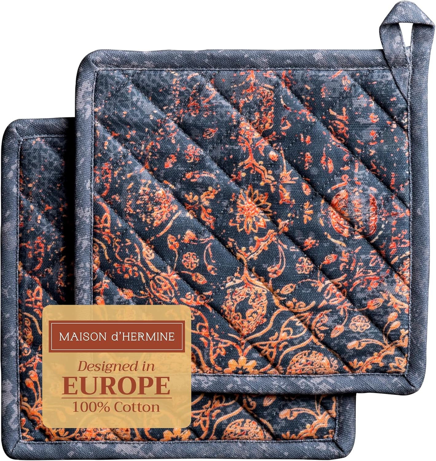 - Package includes: 2 pot holders measures 8"x8". Ideal as a hot pad for dishes, coffee pots, cast iron pans, or cookware. Designed in Europe and Made in India, it blends style, function, and comfort into a daily kitchen essential