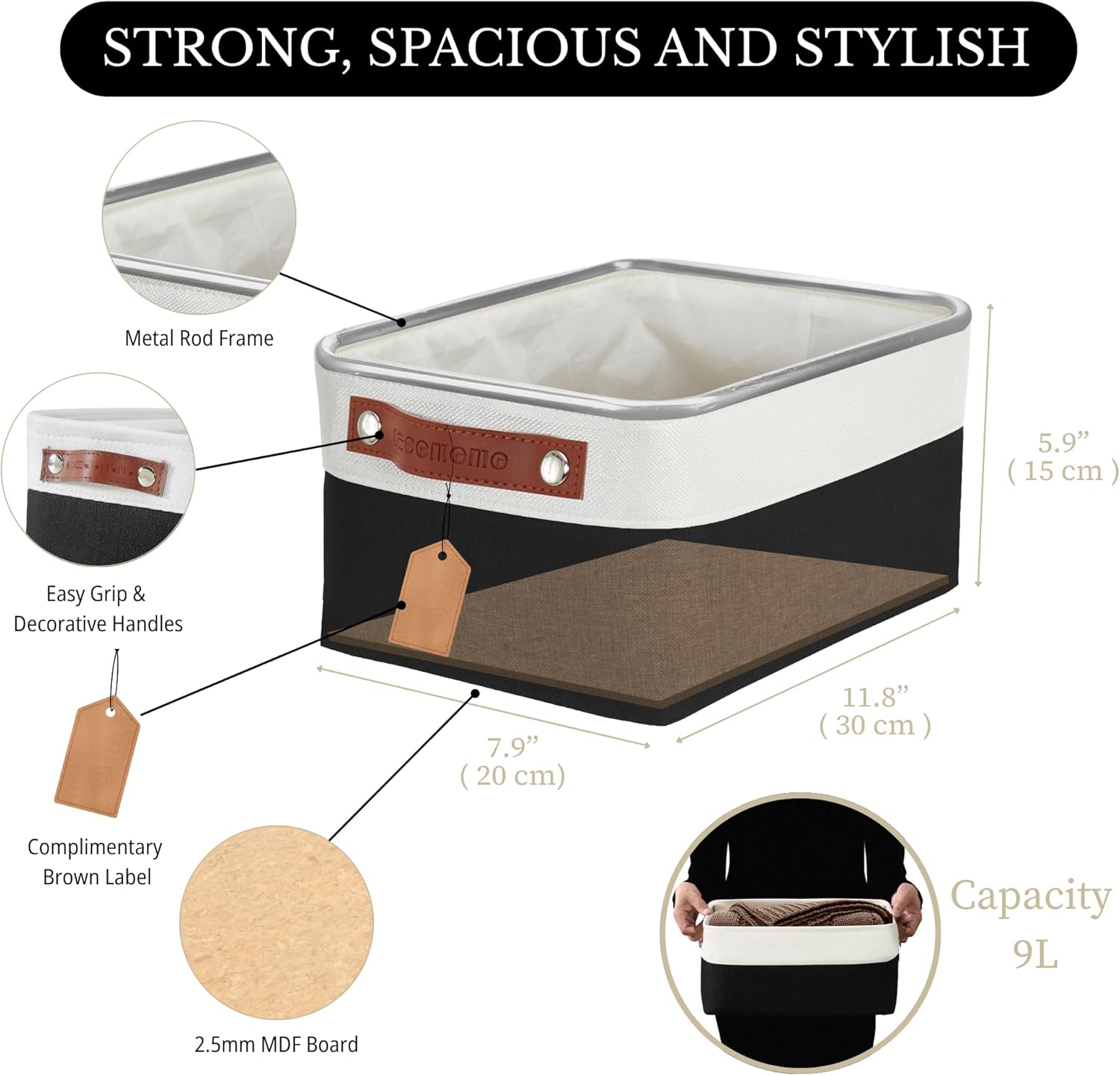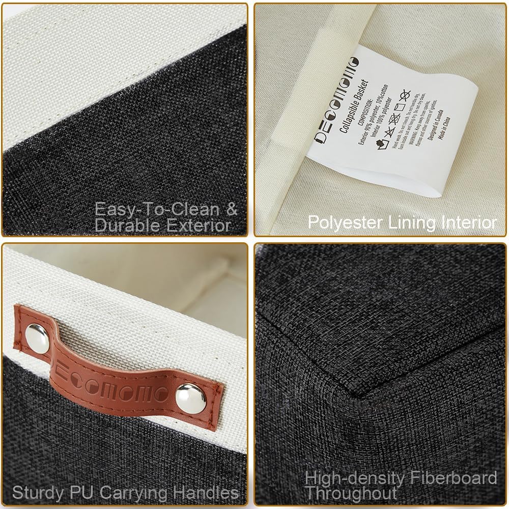 - Durable Design: DECOMOMO's baskets feature a sturdy metal frame, extra thick EVA exterior, polyester interior, 2.5mm MDF fiberboard bottom, and faux leather handles capable of holding up to 15 lbs.