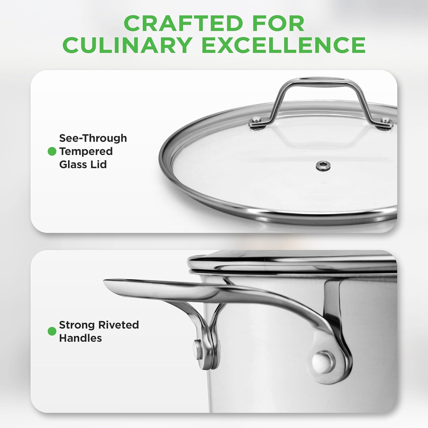 - ERGONOMIC HANDLES: Features ergonomic stainless steel handles for comfortable handling & cooking. Offers a stylish & modern design w/ mirror polished exterior & matte polished interior adding an elegant touch that complements your existing cookwares