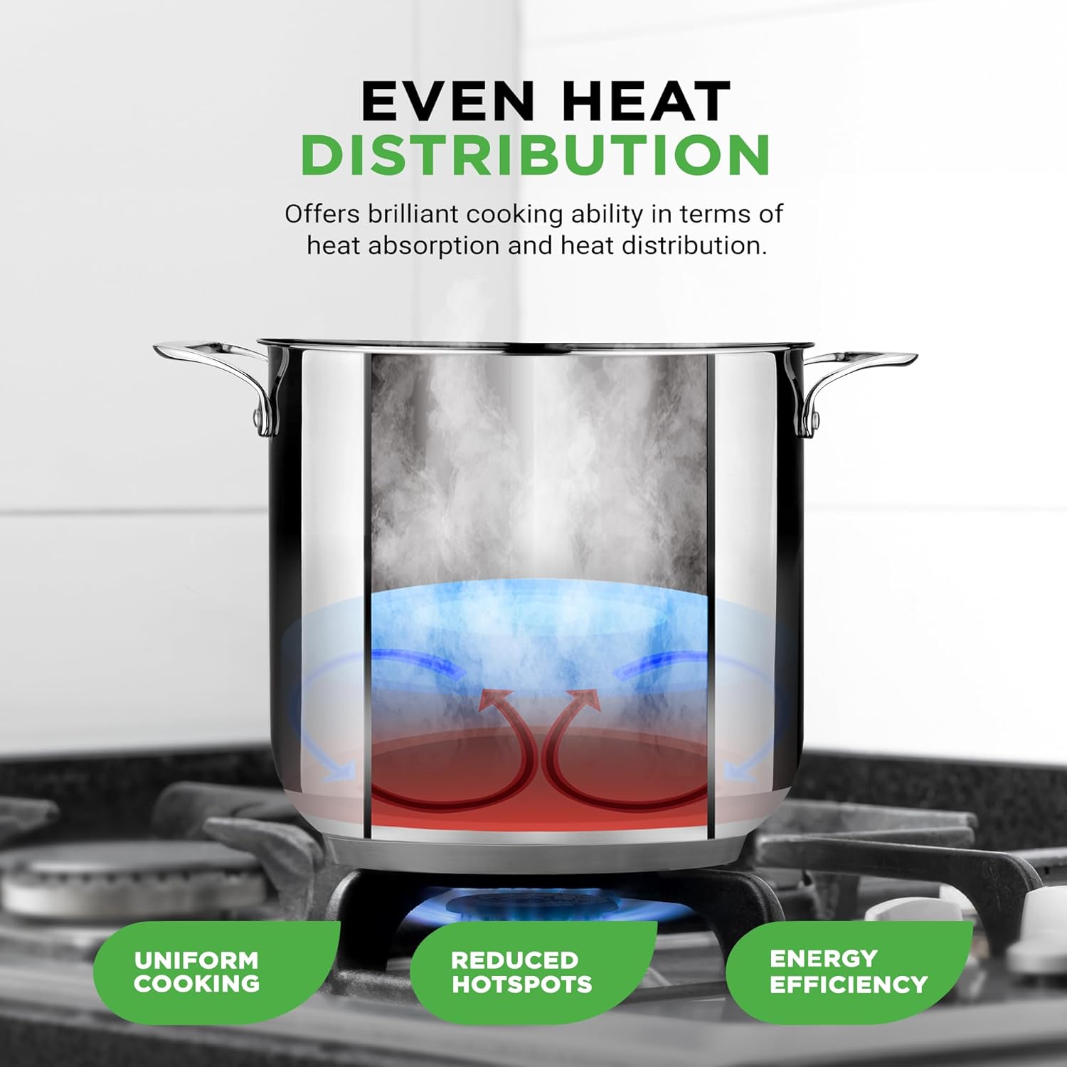 - FOOD-GRADE STAINLESS STEEL: Made of 18/8 non-reactive stainless steel interior which is non-toxic, non-allergic & safe for cooking. It has an impact bonded base for even heat distribution w/ base thickness of 0.208” & pot dimension of 15.6”x11”x12.2”