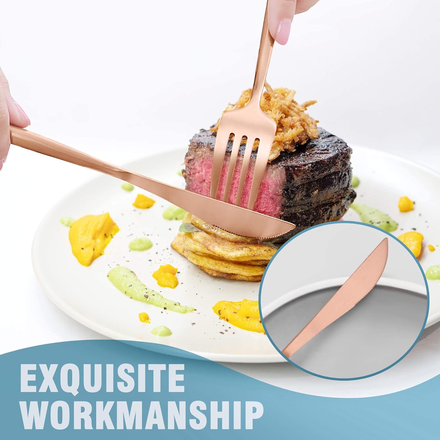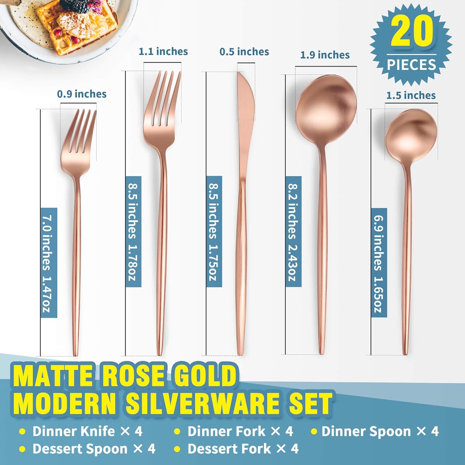 Matte Rose Gold Silverware Set for 4,Modern Stainless Steel Brushed Cutlery Set,20-Pieces Heavy Duty Flatware Set,Knives Spoons and Forks Set Utensils Set, Satin Finish, Dishwasher Safe