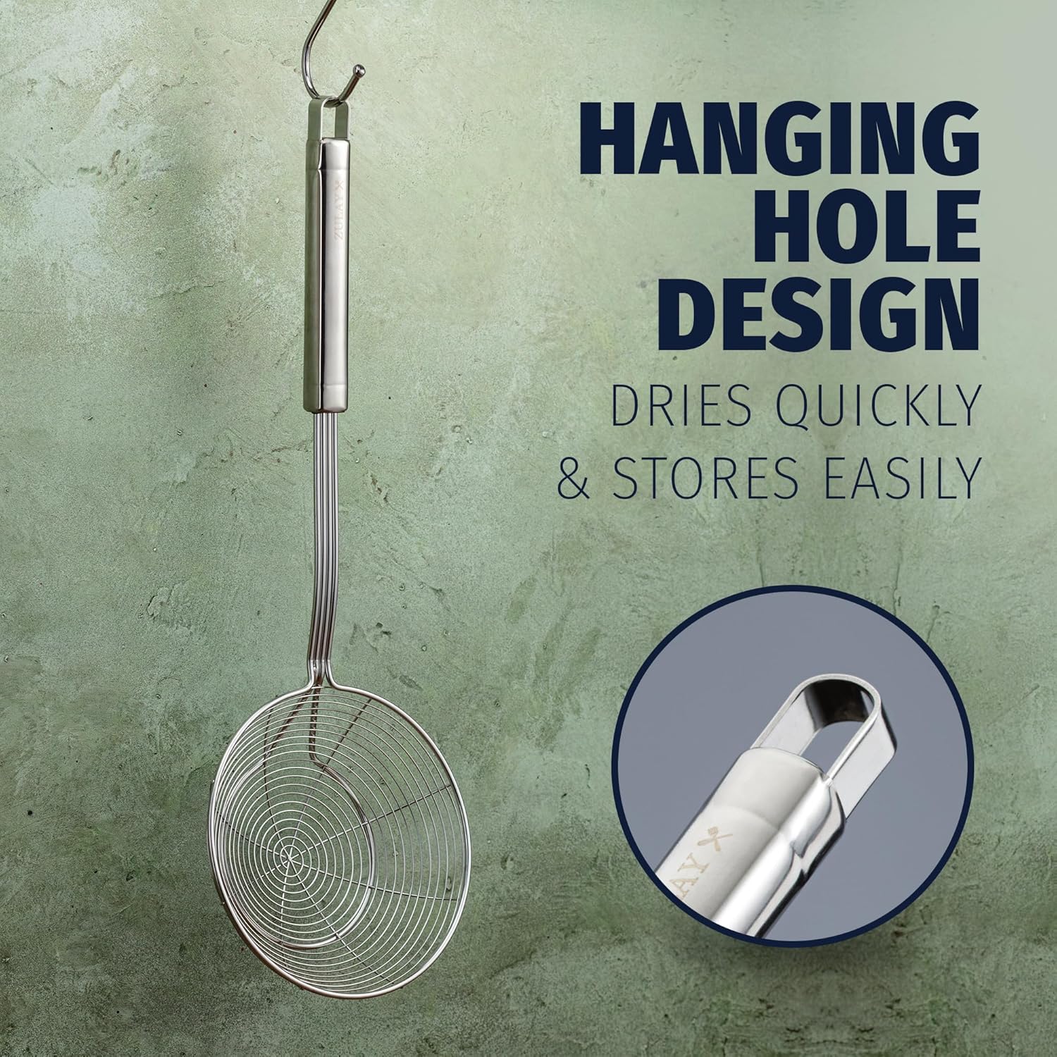 - STRAIN IT ALL AWAY: Our Zulay Kitchen Skimmer Strainer Ladle is all about creating efficiency and effectiveness with every kitchen task you’ll ever need it to. It’s made from premium quality food-grade stainless steel with a straining spoon. This tool is sturdy, durable, and resistant to high heat, making it ideal for blanching, straining in a stockpot, retrieving stir-fried or pan-fried food.
