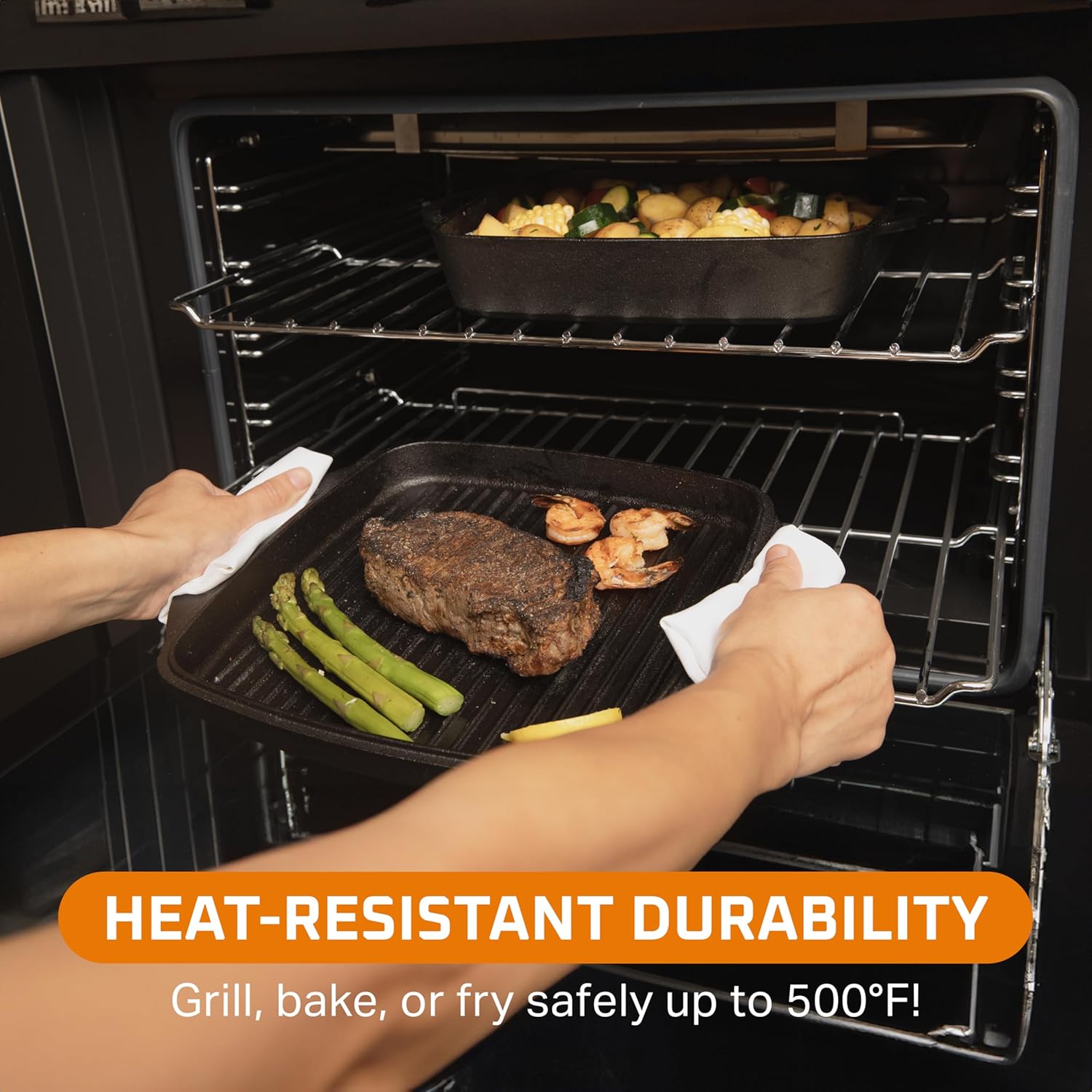 - High-Temperature Resistance: Safe to use in the oven and withstands heat up to 500°F; versatile cast iron grill pan for grilling, frying, or baking on stovetops, ceramic surfaces, and ovens