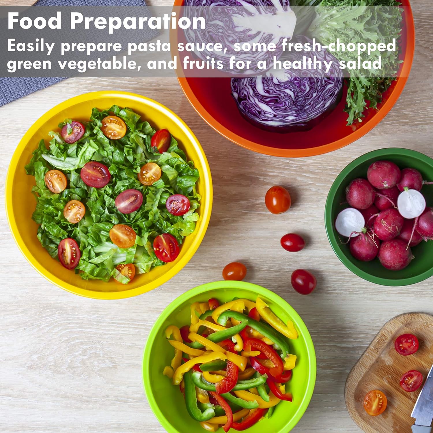- Make Your Cooking Much Easier — A colorful plastic mixing bowls set that are a basic necessity in every kitchen,6 different sizes of 5.28, 3.59,2.22,1.27,0.69, 0.29Qt will complement your cooking and make cooking much easier. Ideal for making a quick salad, preparing food, mixing batters, or storing and serving food.