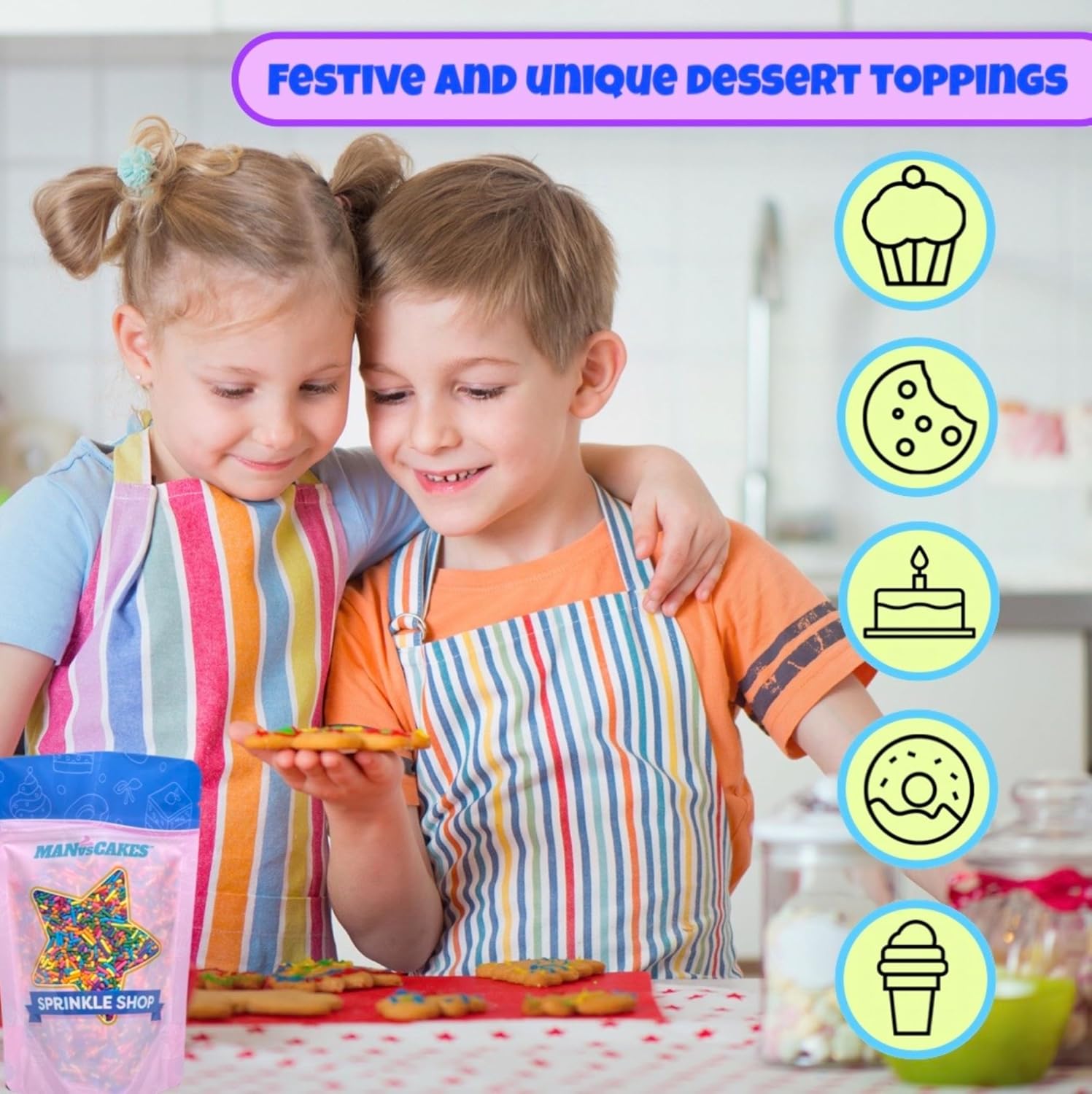 - DAZZLING DESSERT TOPPINGS FROM MANVCAKES: Your treats deserve to dazzle! Our sweetshop brings your sweets and delights some classy, fun, festive, colorful, and shimmering sprinkles inspired by art and themes that invite you to unveil your child within. At Manvscakes, we offer you unique themed sprinkle mixes for every occasion!