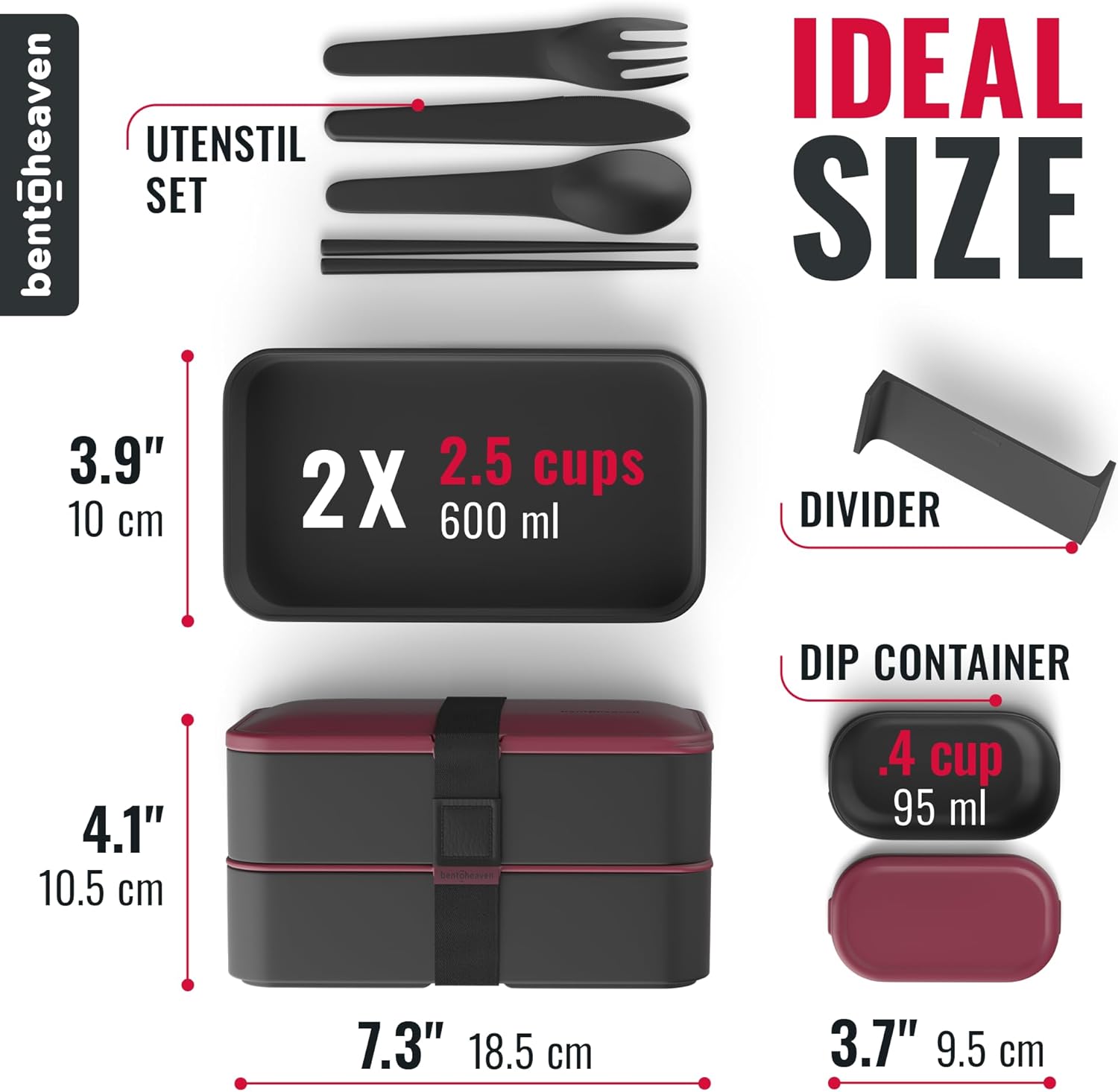 - Your meals deserve a Premium Bento Box! It features 2 stackable compartments that hold 40 oz., 2 silicone sealed lids, divider, dip container, chopsticks, fork, spoon, knife, and a sealing strap.