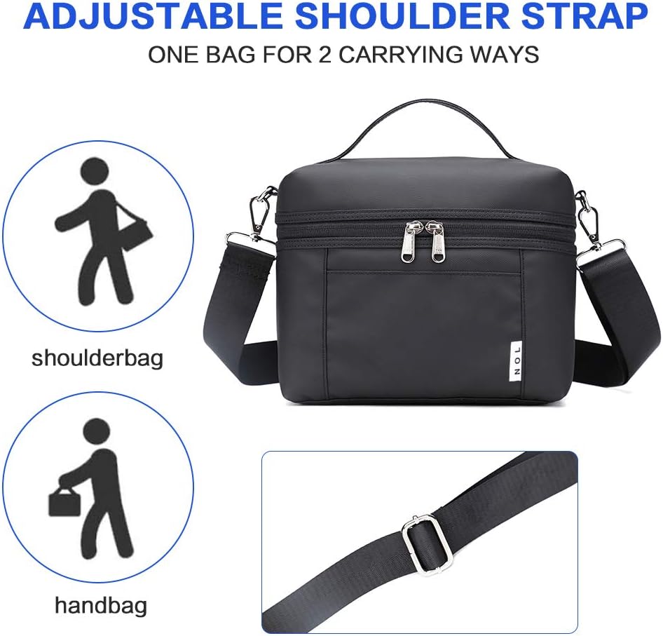 - Small Size: This SMALL lunch bag dimensions: 8.3IN x 5.5IN x 6.7IN, which can hold ONE PERSON'S meal. Capacity: 4L. You can put a lunch box, some snacks, some fruits, a flatware set and an ice pack or fit 7 cans of 330ml drinks in this black lunch bag. The NOL lunch bag features a soft handle for easy placement in a backpack or large tote and offers two carrying options: top handle or cross-body with a detachable and adjustable long shoulder strap. Please don't put ice cubes in lunch bag.
