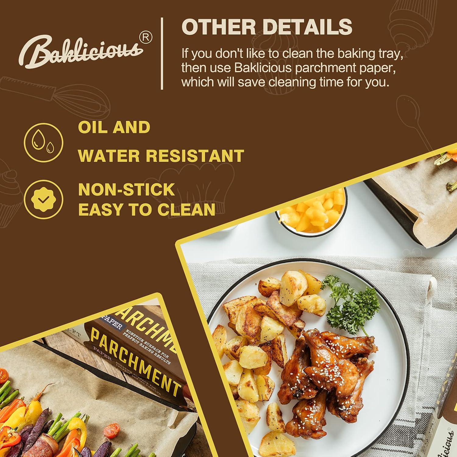 - NON-STICK BAKING PAPER FOR OVEN: Our nonstick parchment paper roll for baking easily release your stickiest food without sticking it to the baking pan. Most food items conveniently slide off from the baking tray and you just need to remove the brown parchment paper. These non-sticky baking paper also exclude any inconvenience of using oil or sprays for perfect baking.